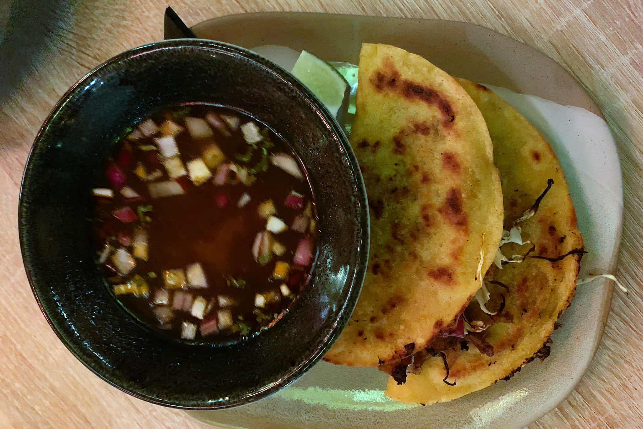 Menu items include the bún bò huế tacos, a dish that combines Vietnamese spices, oaxaca cheese, pickled onions, cilantro cabbage, and served with bún bò hue consommé.