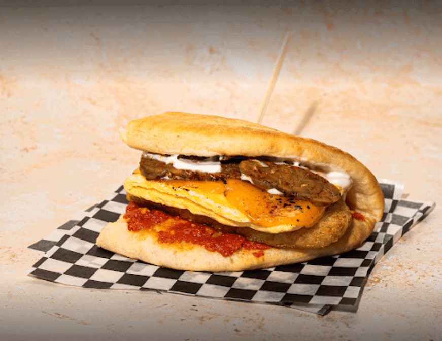 The No Bones Kitchen menu features items such as a breakfast sandwich with JUST Egg and tempeh bacun, a turkey club made with seitan “turkey” slices, and a Beyond Meat sausage roll — to name a few.