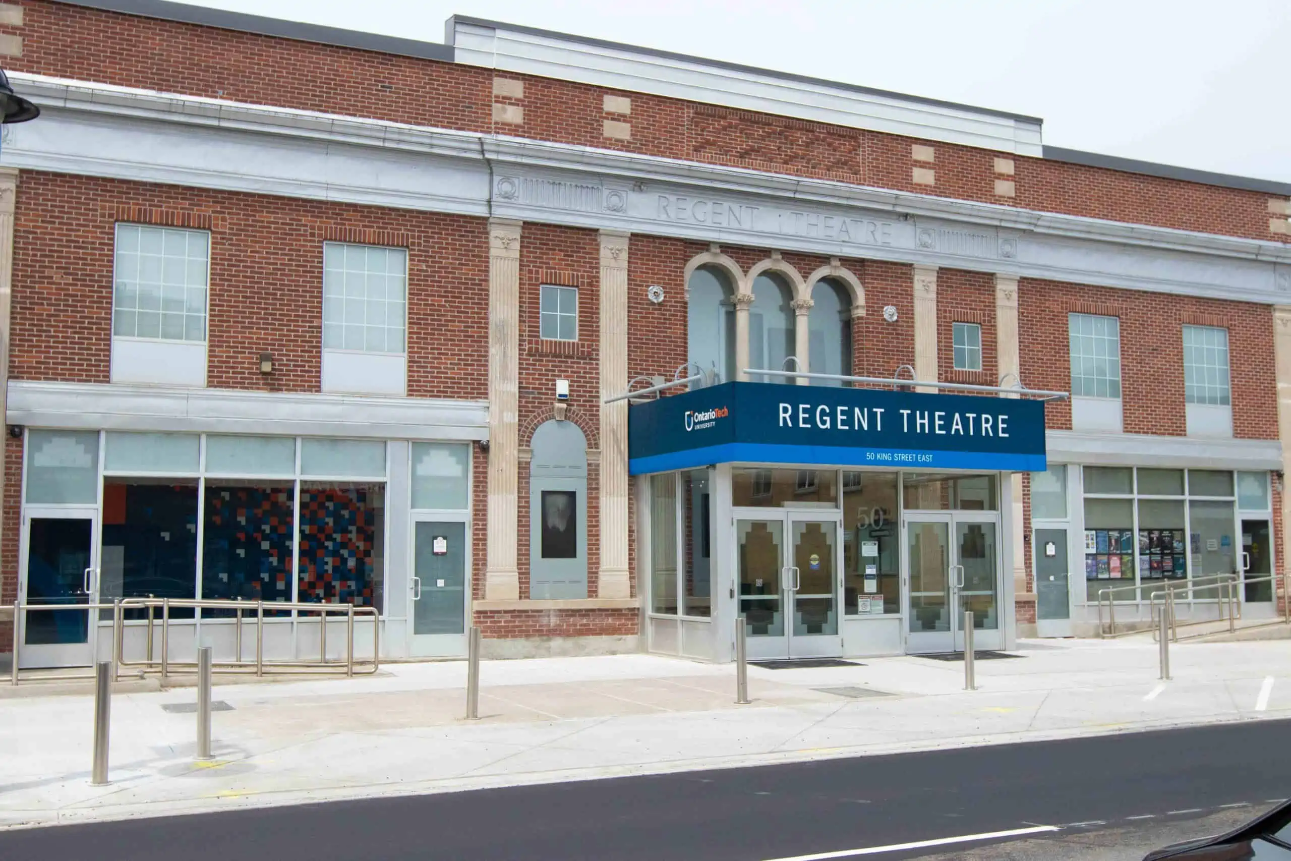 The Regent Theatre was built by Norman McLeod Ltd, at a cost of $100,000. The King Street façade of the theatre was modeled on Georgian architectural lines and as such the architectural features are very symmetrical. The building is one of the few remaining examples in Oshawa of this classically inspired architectural style.