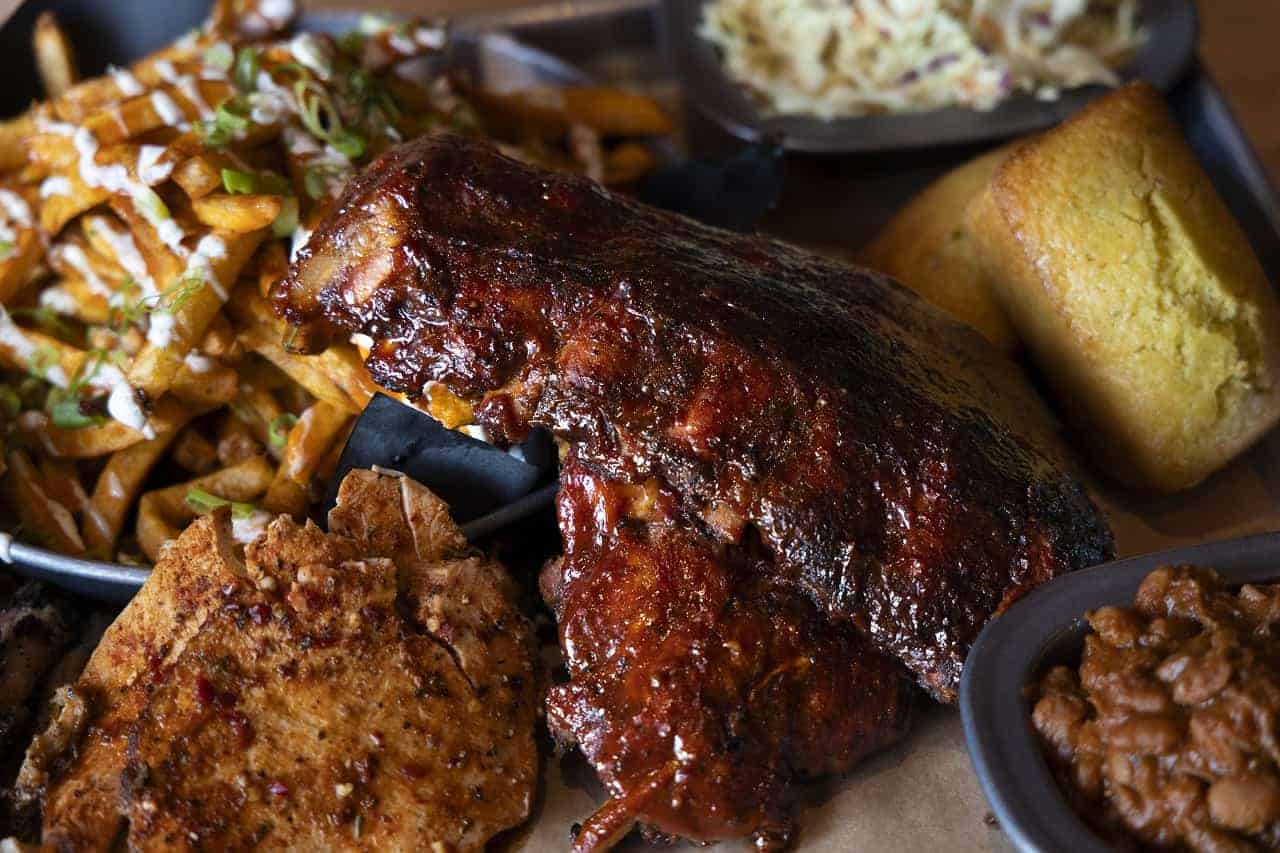 The brisket is high-quality prime grade beef, seasoned with salt and pepper, smoked for 12 hours, and hand-sliced to order. The pulled pork is hand pulled to order in a Carolina style, smoked with a house-made rub and served on the side with a Lexington-style vinegar or Carolina BBQ sauce. The Memphis-style Baby Back Ribs are smoked and glazed with house-made rub and BBQ sauce. The tender, pull-off-the-bone meat is paired with a slice of daily-baked Jalapeno cornbread and fresh-cut fries.