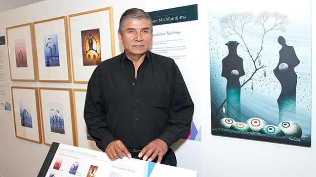 Mishibinijima means “Birchbark Silver Shield.” As a boy, Mishibinijima was given the name James Alexander Simon by missionaries who found his name difficult to pronounce. His path as an artist was set early on as he was growing up in Wikwemikong. In some ways he feels that his destiny in art found him, pulling him in an unexpected direction away from an inclination to become an RCMP officer and toward a life as a professional artist.