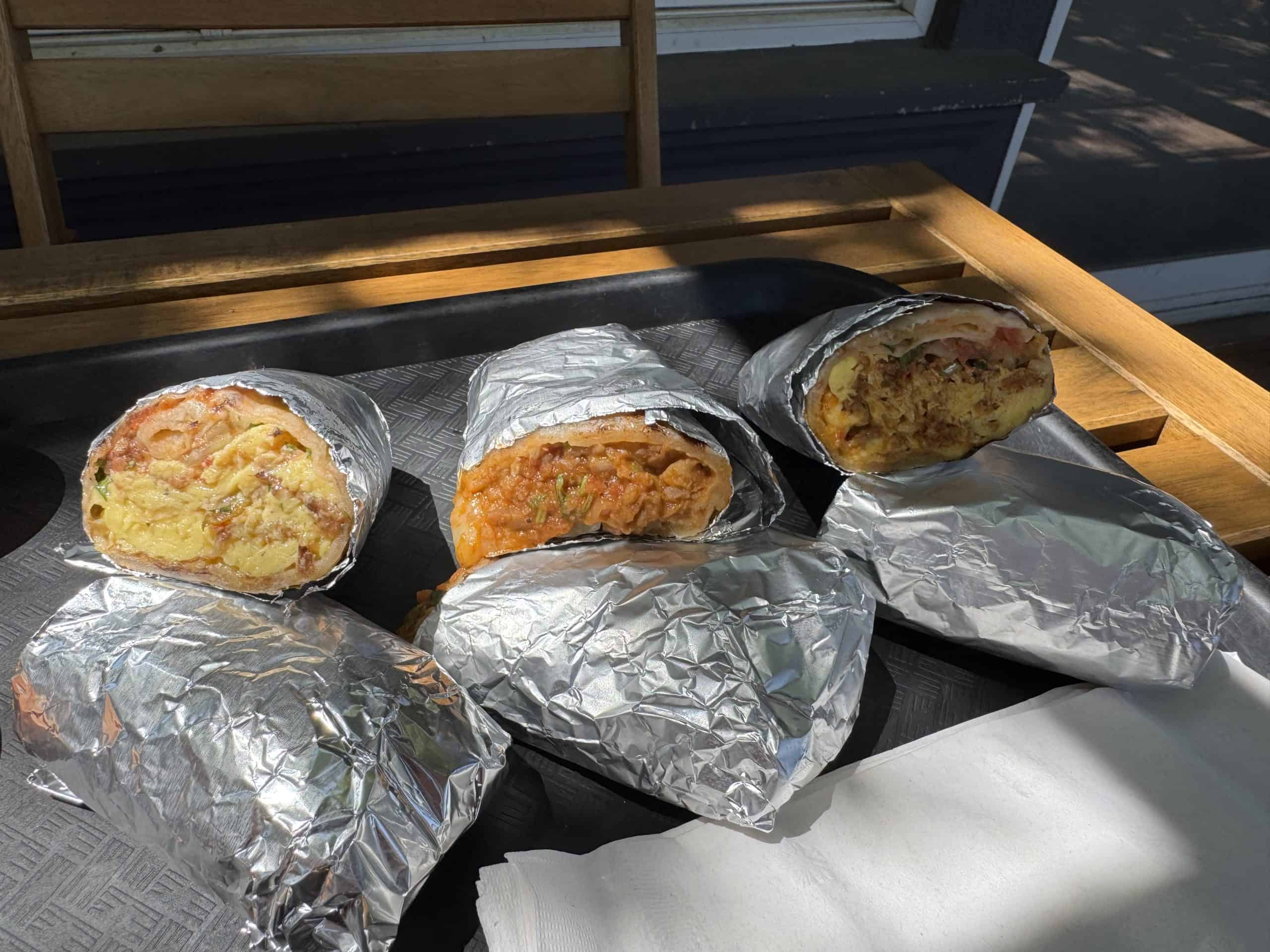 They have a bean and cheese burrito on their regular menu, but come on the weekends for their breakfast burritos wrapped in flour tortillas that are made in house from scratch. They’re made with lard so they’re extra soft and stretchy, but they’re also very durable.