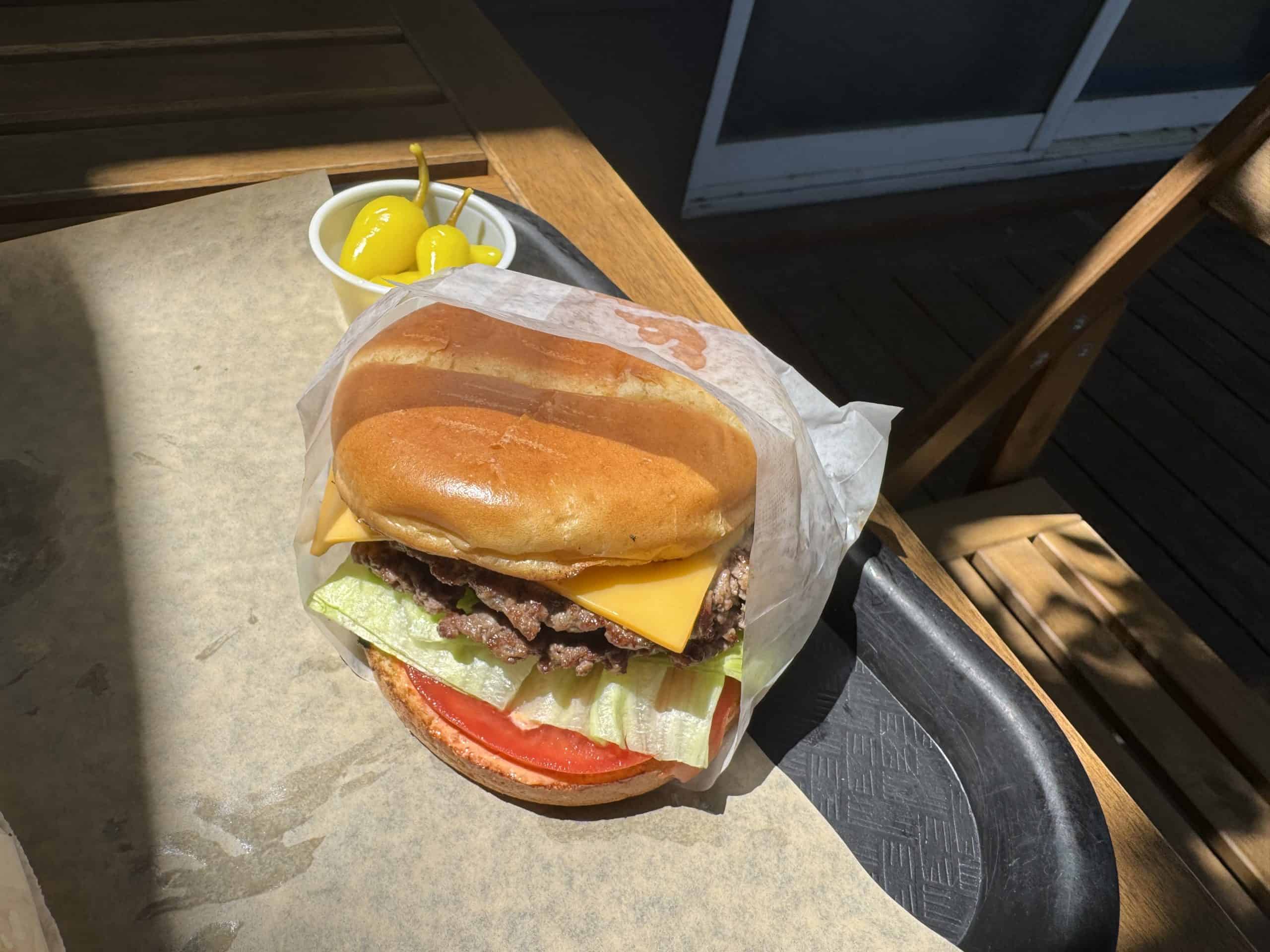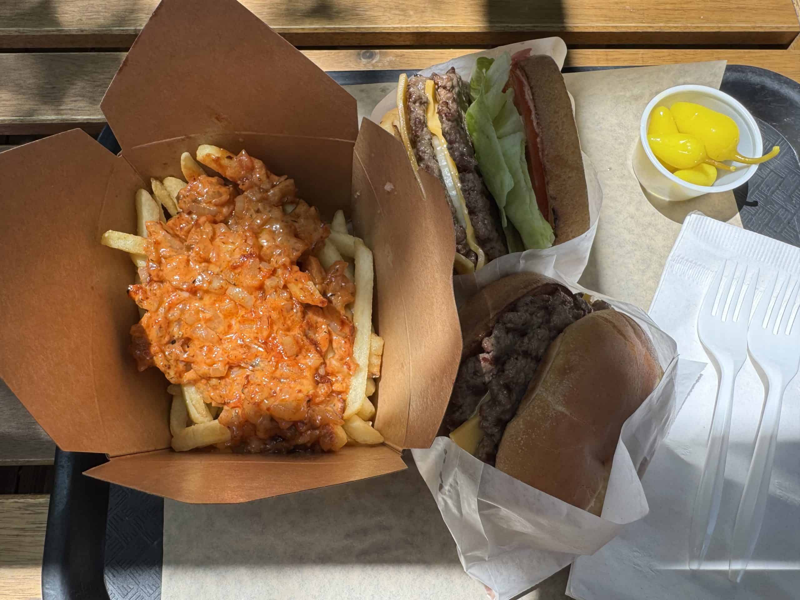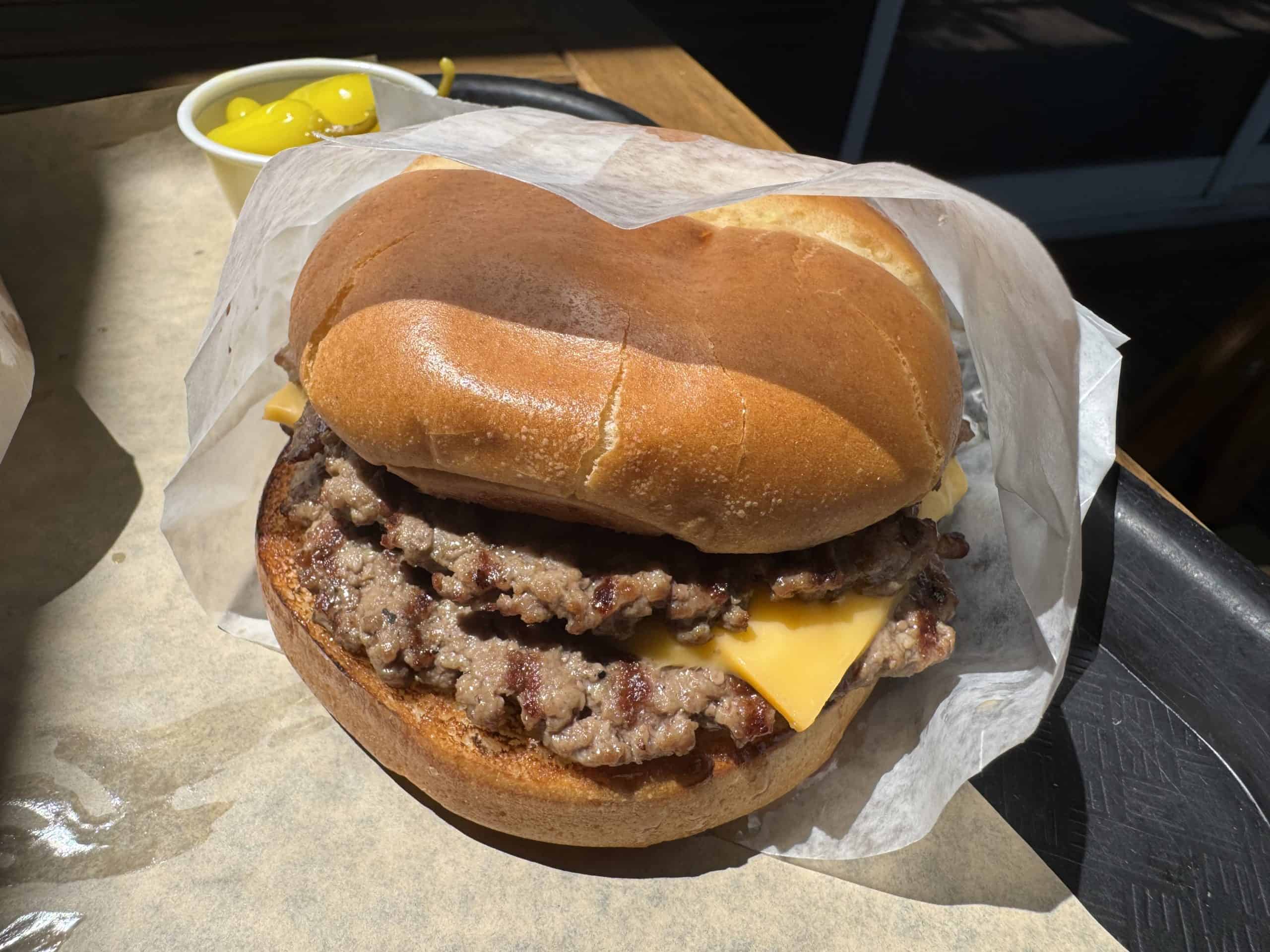 It comes with two patties, cheddar, pickle, charred onion, mustard and ketchup for a classic roadside/fast food vibe.