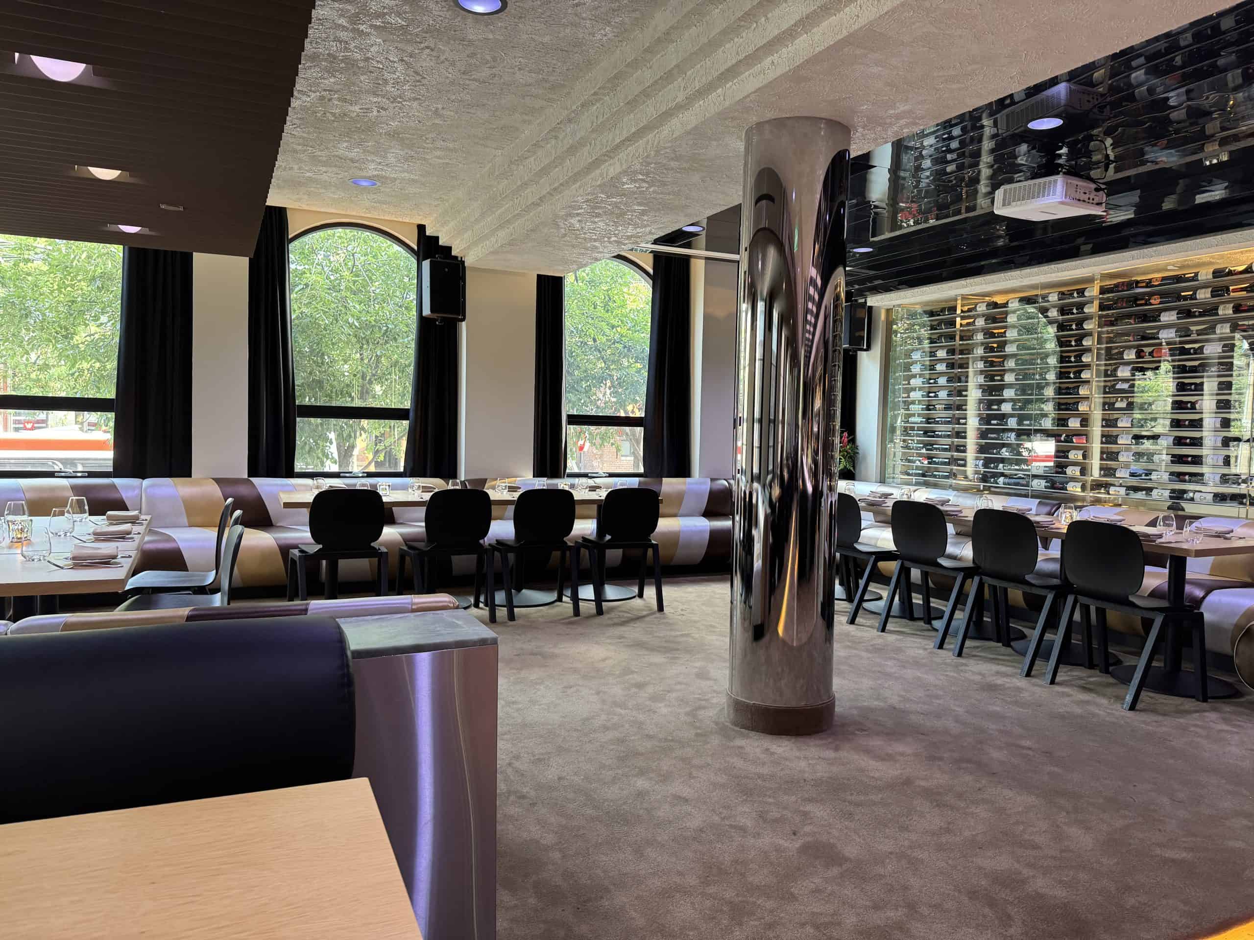 The space has a clubby vibe that’s accentuated by soft ambient lighting, with large curved booths for group hangs with a VIP vibe.