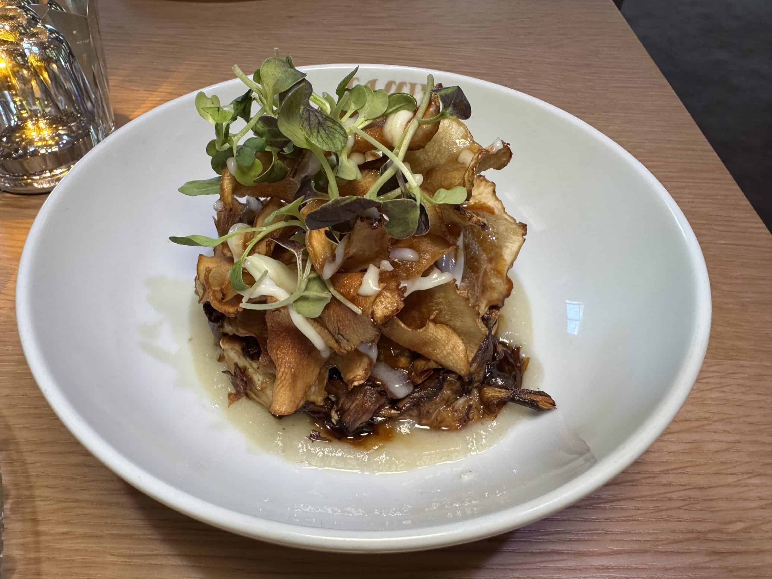An artichoke appetizer shows the versatility of the vegetable, pairing crunchy fried artichokes with softly cooked Jerusalem artichokes, finished off with a pecorino fondue and sichuan pepper for a slight kick.
