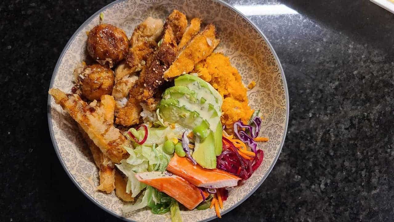 There’s few foods I like better than good chicken, so for this Restaurant Reco I tried the Chicken Katsu Donburi: Fried chicken cutlets with lettuce, seaweed salad, edamame, crab meat, avocado, cucumber, fish eggs, yam tempura, takoyaki, corn, spicy mix, topped with Hiroi spicy mayonnaise and veggie sweet sauce.