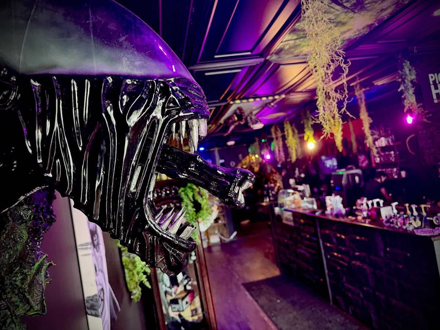 The interior space of the cafe is totally decked out in all kinds of horror-themed decor, with iconic figures from some of the most famous scary movies found all around the coffee shop.