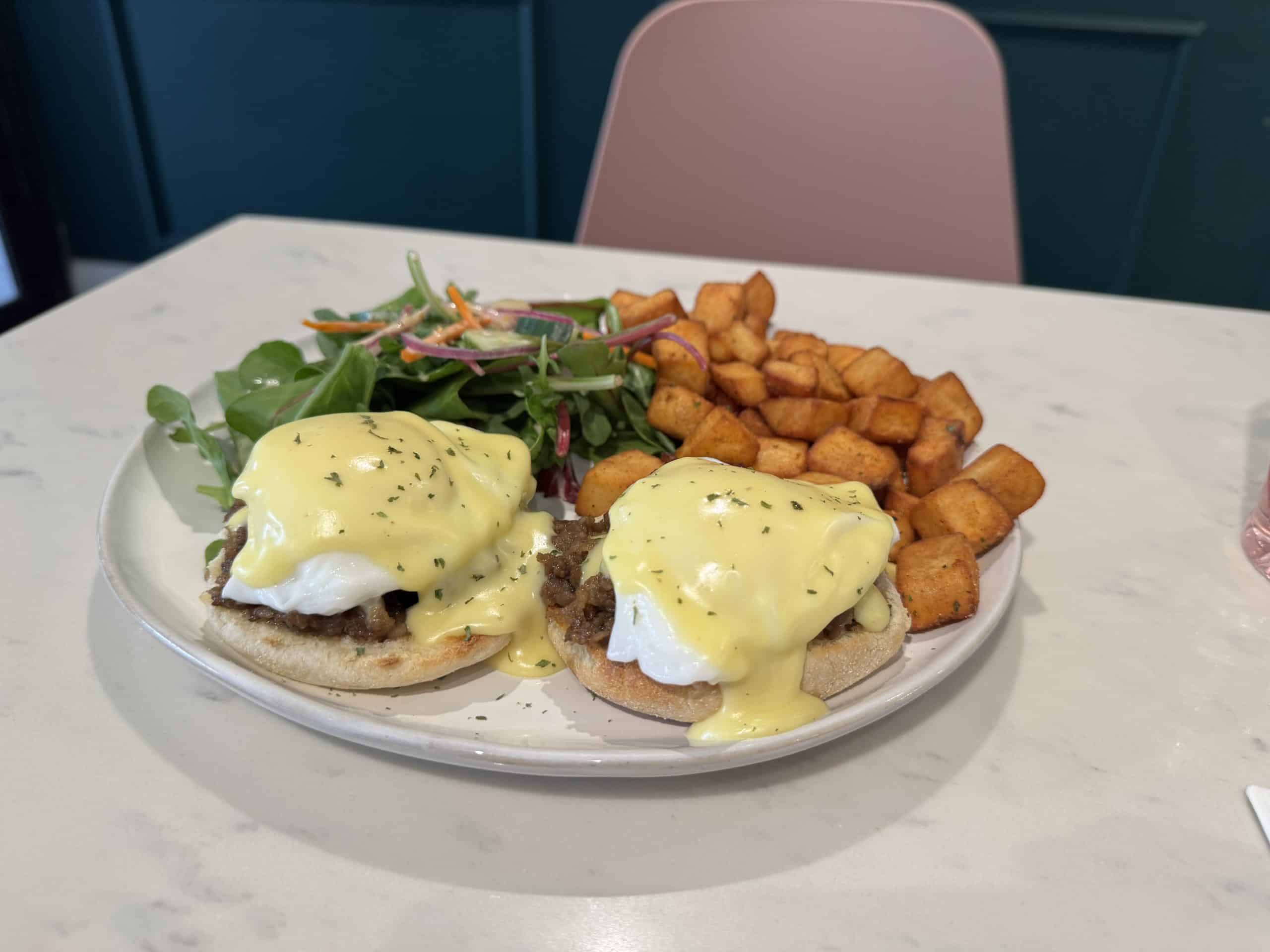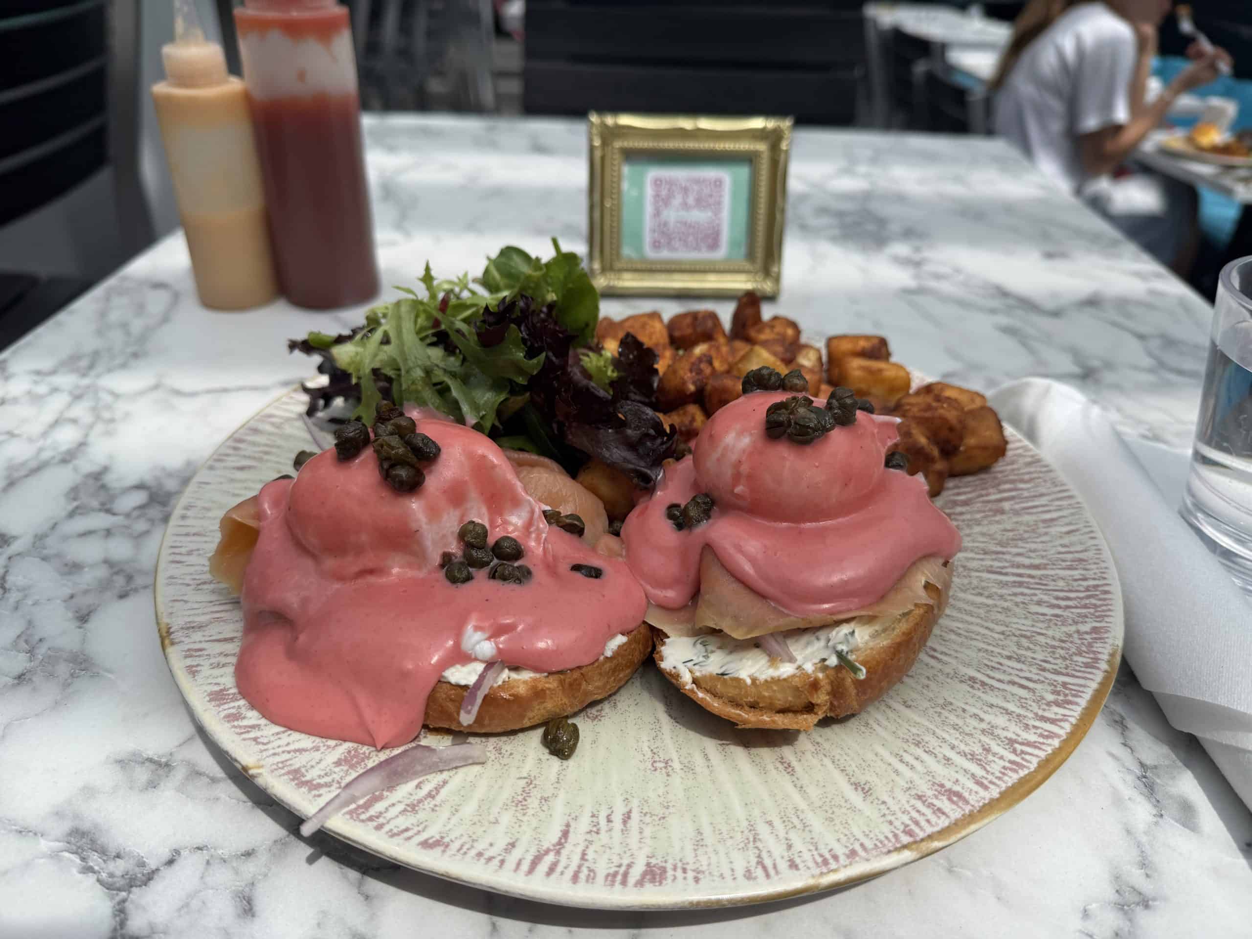 The smoked salmon Benny comes on a flaky croissant with herby dill cream cheese and crispy fried capers for that bagel and lox vibe, all draped in the prettiest beet hollandaise.