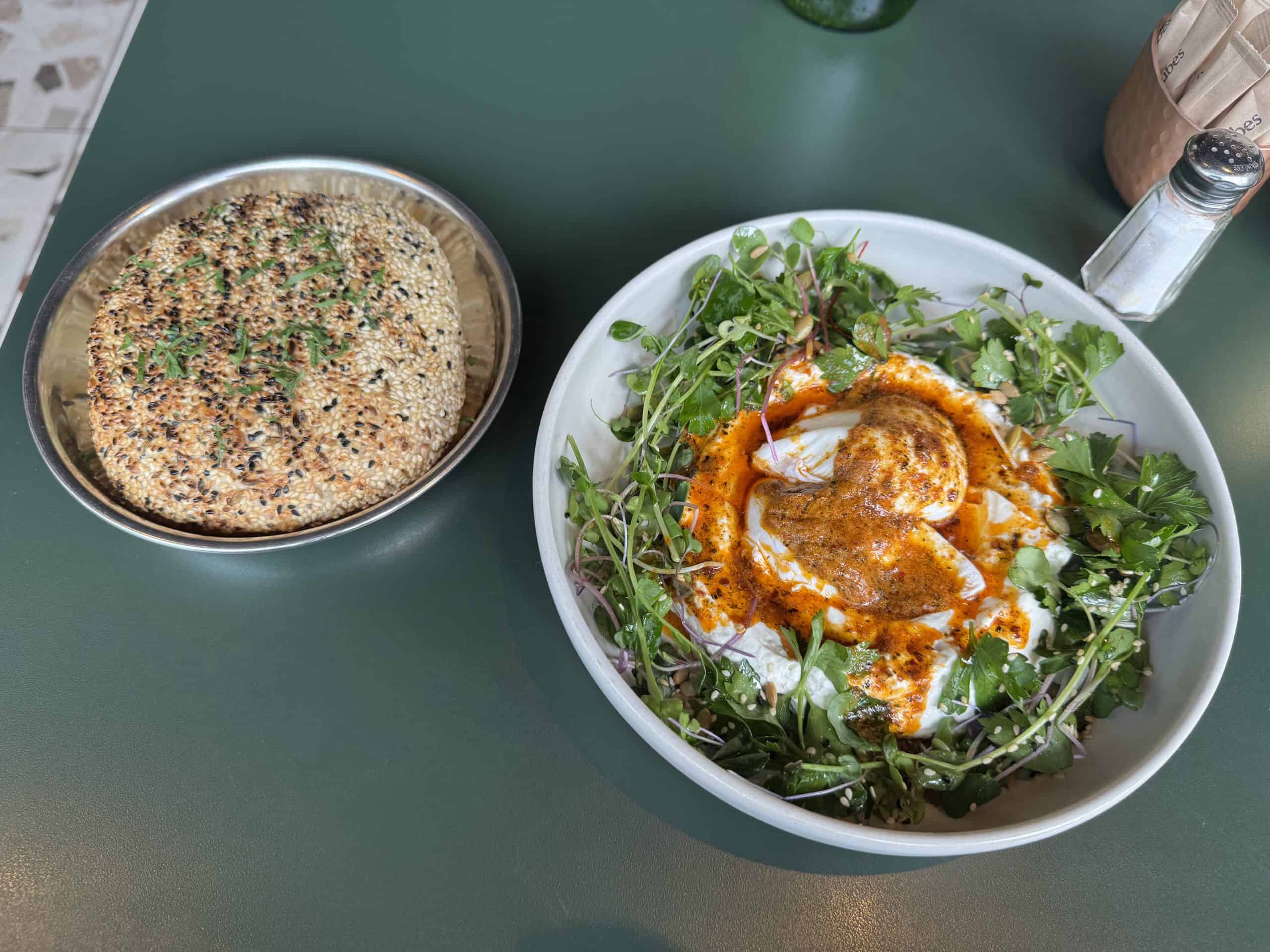 The cilbir is an excellent option, a Turkish-influenced dish of thick garlic confit labneh cradling two soft poached eggs, all surrounded by spiced butter, herbs, sprouts, seeds and puffed grains. A heavily seeded, puffy grilled pita is perfect for dipping.