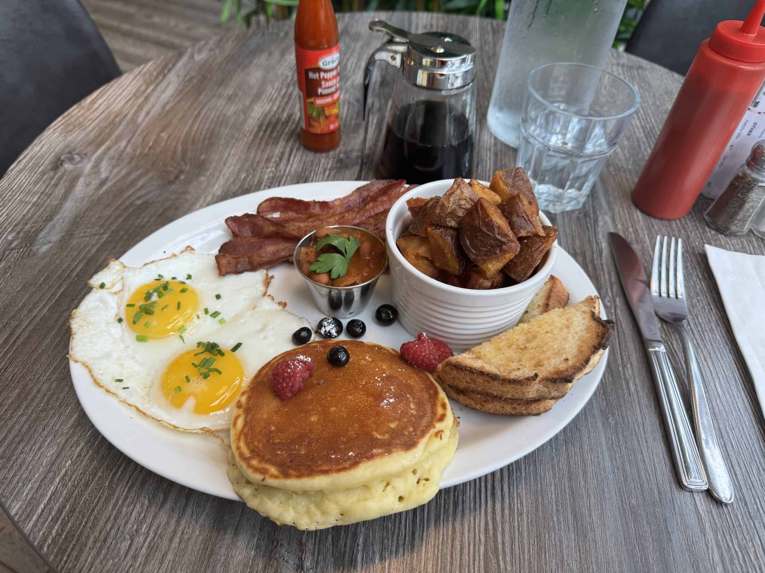 The farmer’s breakfast is a great option for those looking to try a little of everything. It comes with two eggs, one of their signature pancakes, thick but crispy bacon, mixed berries, mildly spiced Mexican-style mixed beans, thick cut Cajun home fries and buttery toast made using house bread.