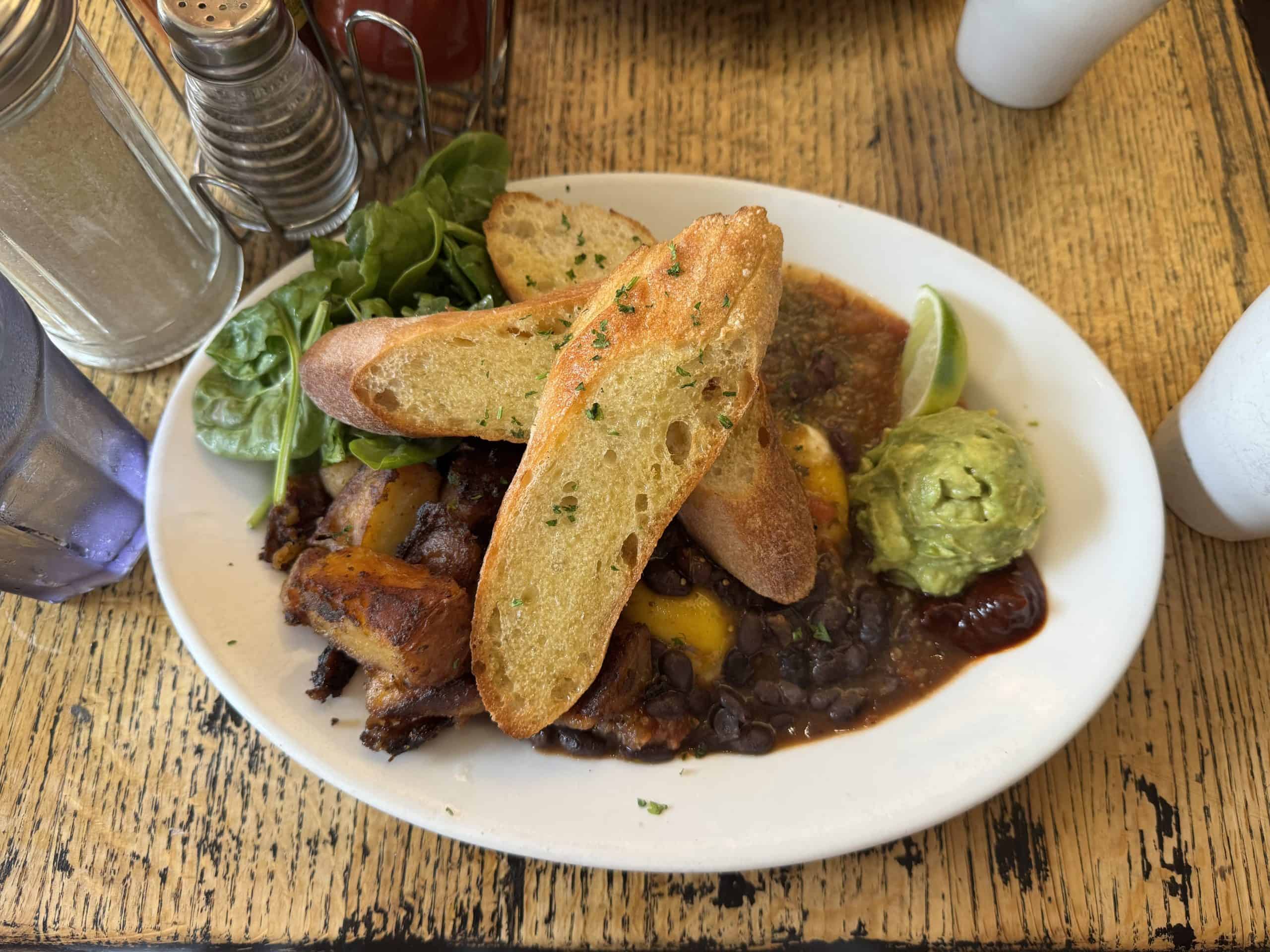 That includes their specialty, the Huevos Divorciados. It’s a delightful mess of two sunny eggs on a corn tortilla swimming in spicy red and green salsa along with black beans. On the side, there’s a deeply flavourful ancho jam and creamy, chunky house guacamole as well as salad and home fries. The plate is crowned with three generous slices of toasted baguette to soak up all that goodness.