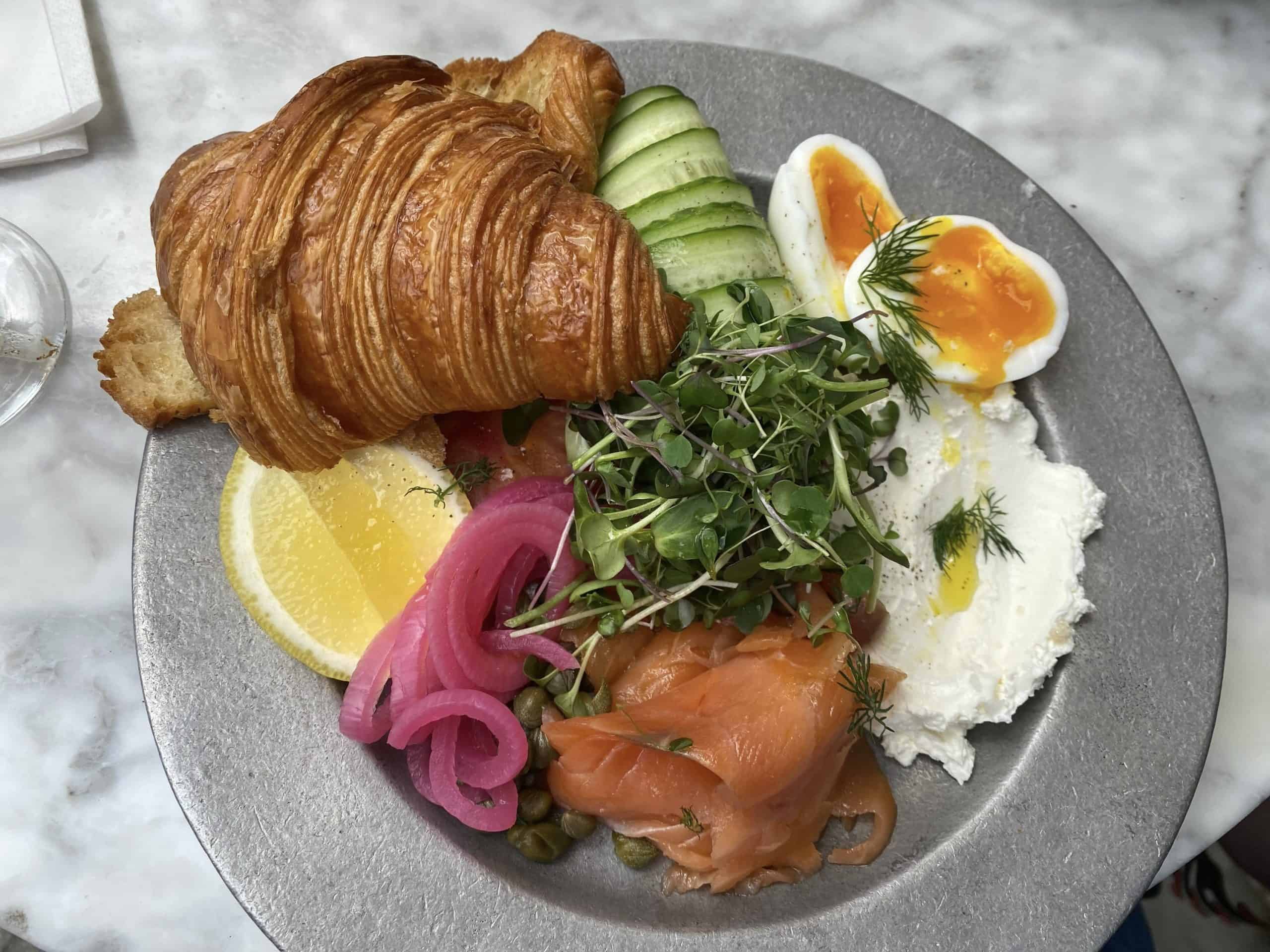 The Manita Breakfast is the ultimate snacky brunch plate with smoked salmon, capers, red onion, cucumber, tomato, a swipe of cream cheese and a perfectly soft egg, all waiting to be assembled onto a croissant. Their elaborately garnished Caesars are not to be missed.