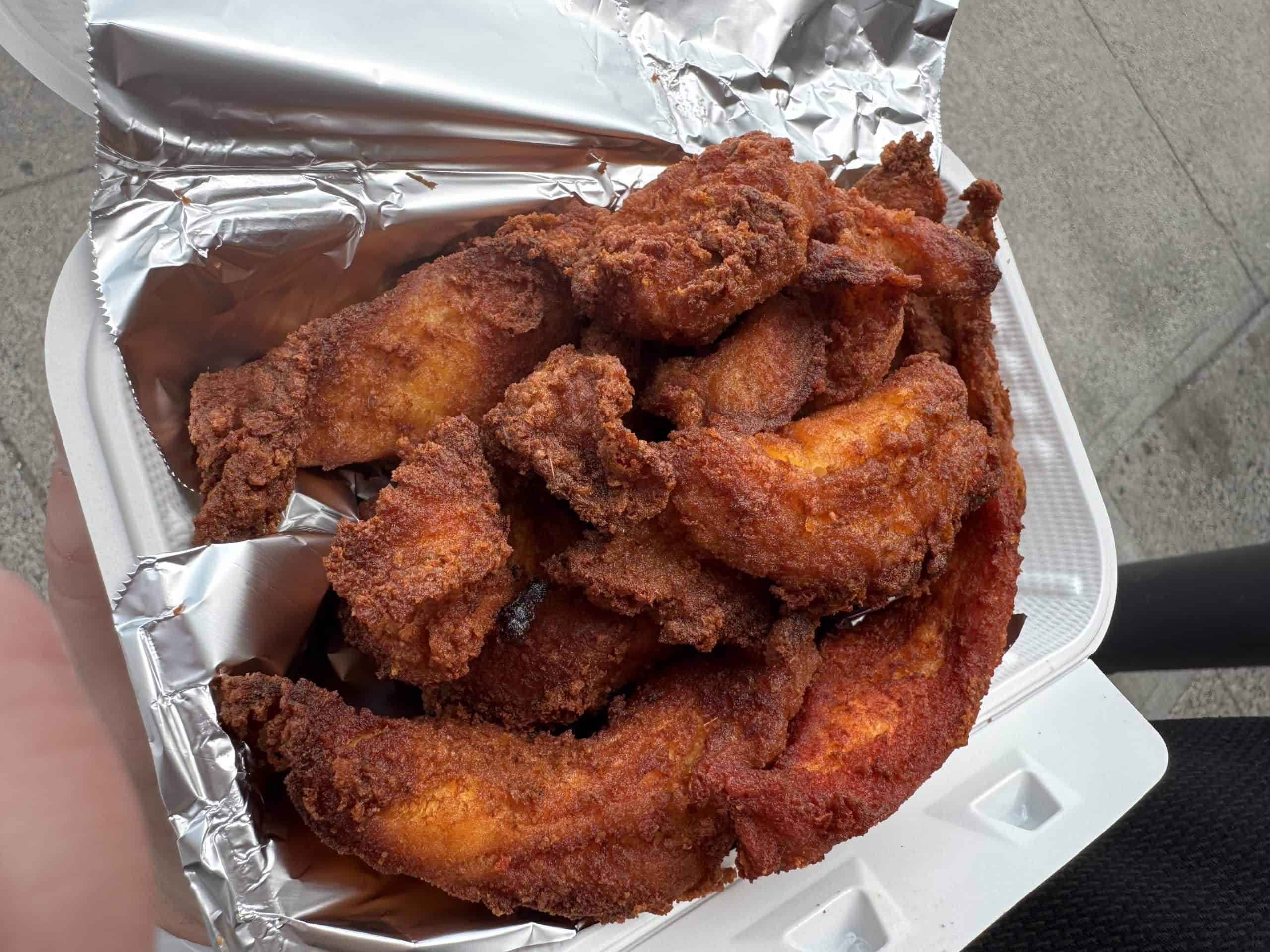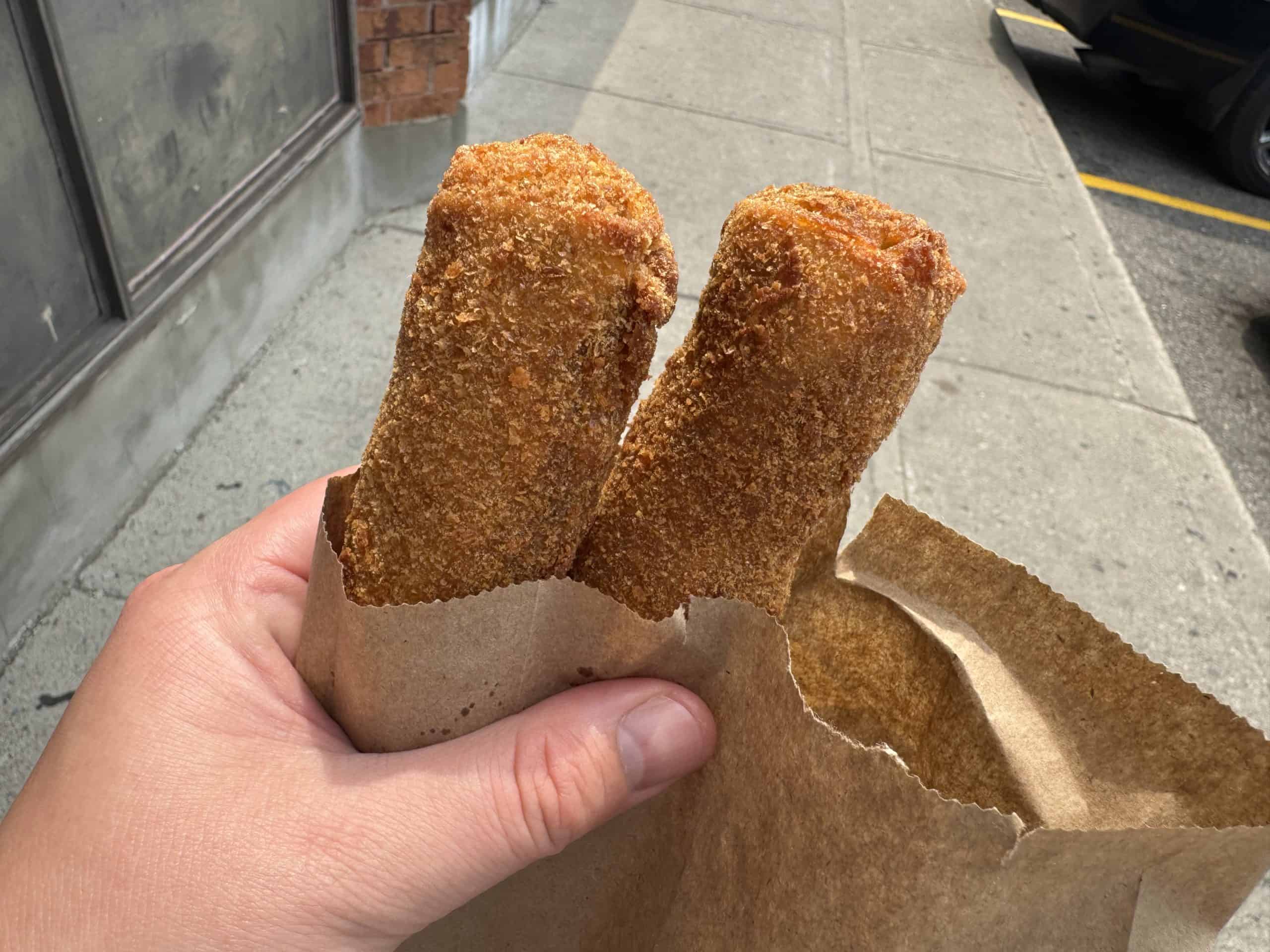 It’s fried to a crispy golden brown with mild white flesh on the inside, and comes served with a tangy, slightly spicy dipping sauce.