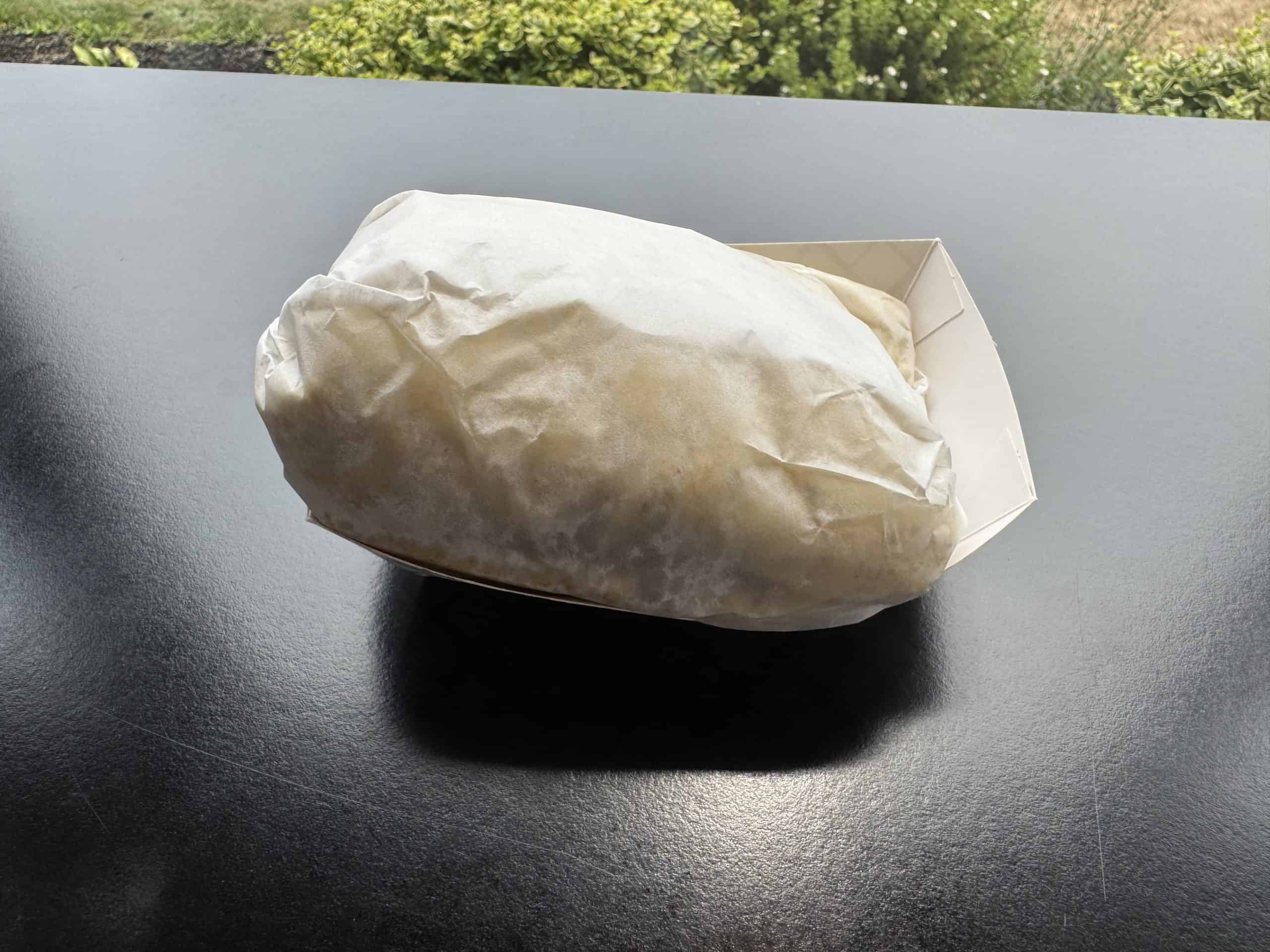 The veggie roti is a great deal because it comes with your choice of three kinds of veggies: spinach, pumpkin, chana, potato or curry mango for a dollar extra. You get a generous helping of each kind of veggie, and the dhalpuri roti with a crumbly layer of split pea inside adds extra bulk.