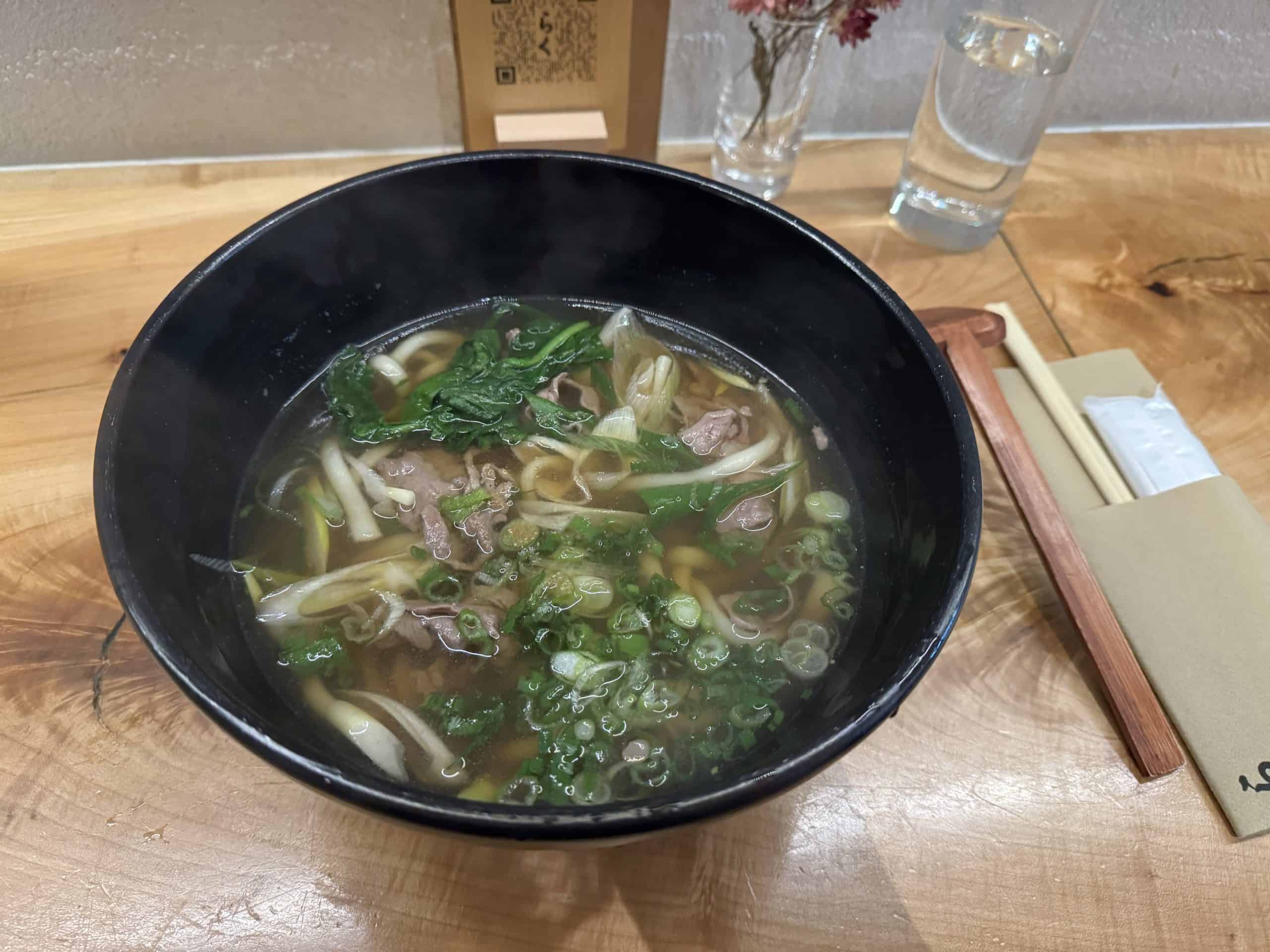 The gyunan is a popular option, an impossibly large bowl of clear but rich broth swimming with a generous portion of noodles along with strips of chewy, fatty beef balanced out by sharp Tokyo negi (onion). All the greens in the soup add an element of freshness that feels definitively Japanese.