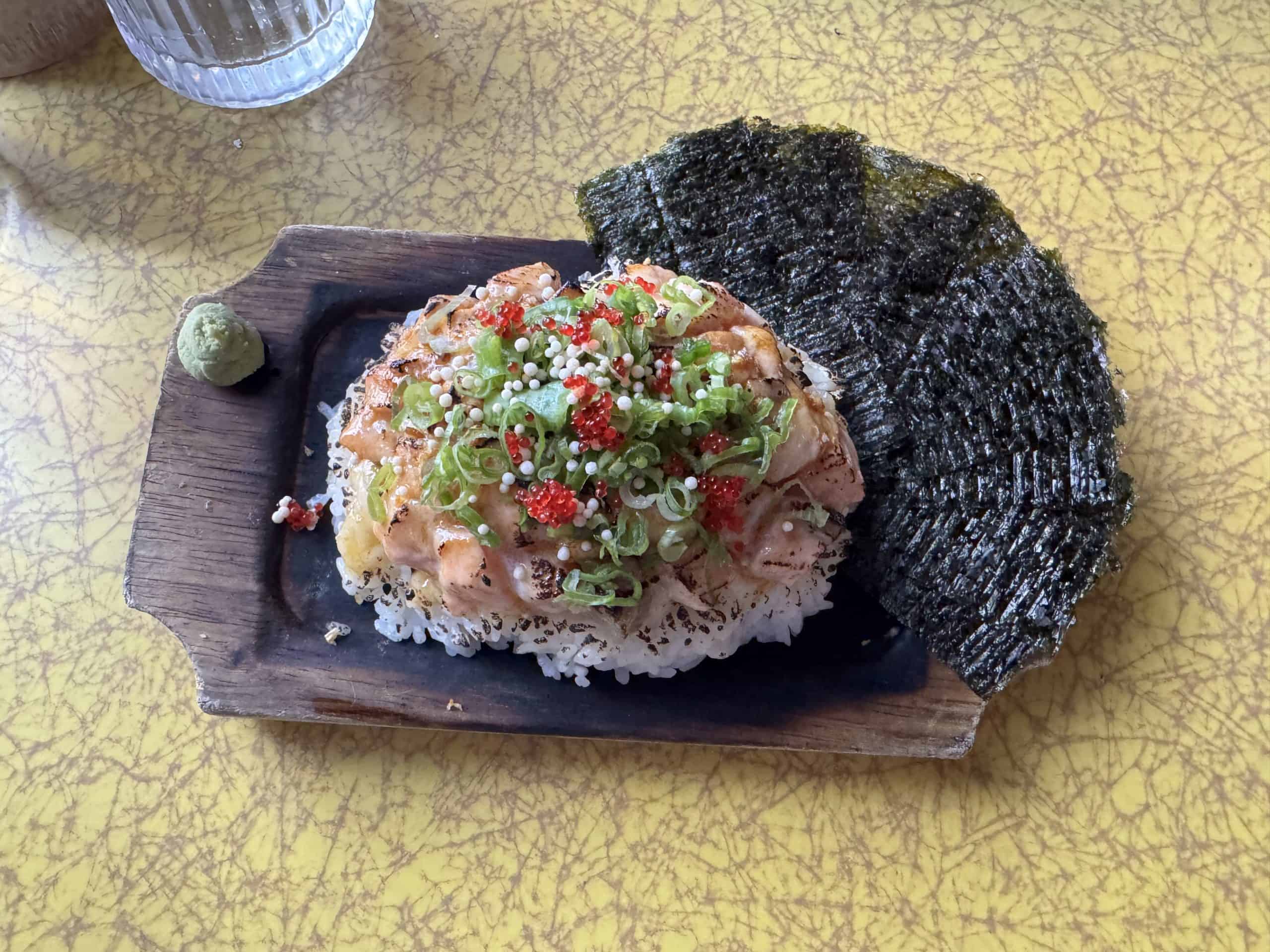 Some classic options are their tuna tartare and salmon aburi, both served with nori sheets for DIY assembly. The salmon aburi comes on a fluffy bed of rice, the fish lightly charred and smokey on the outside, sweet and soft on the inside. The whole dish is set off by a creamy sauce as well as crunchy toppings of tobiko and onion.