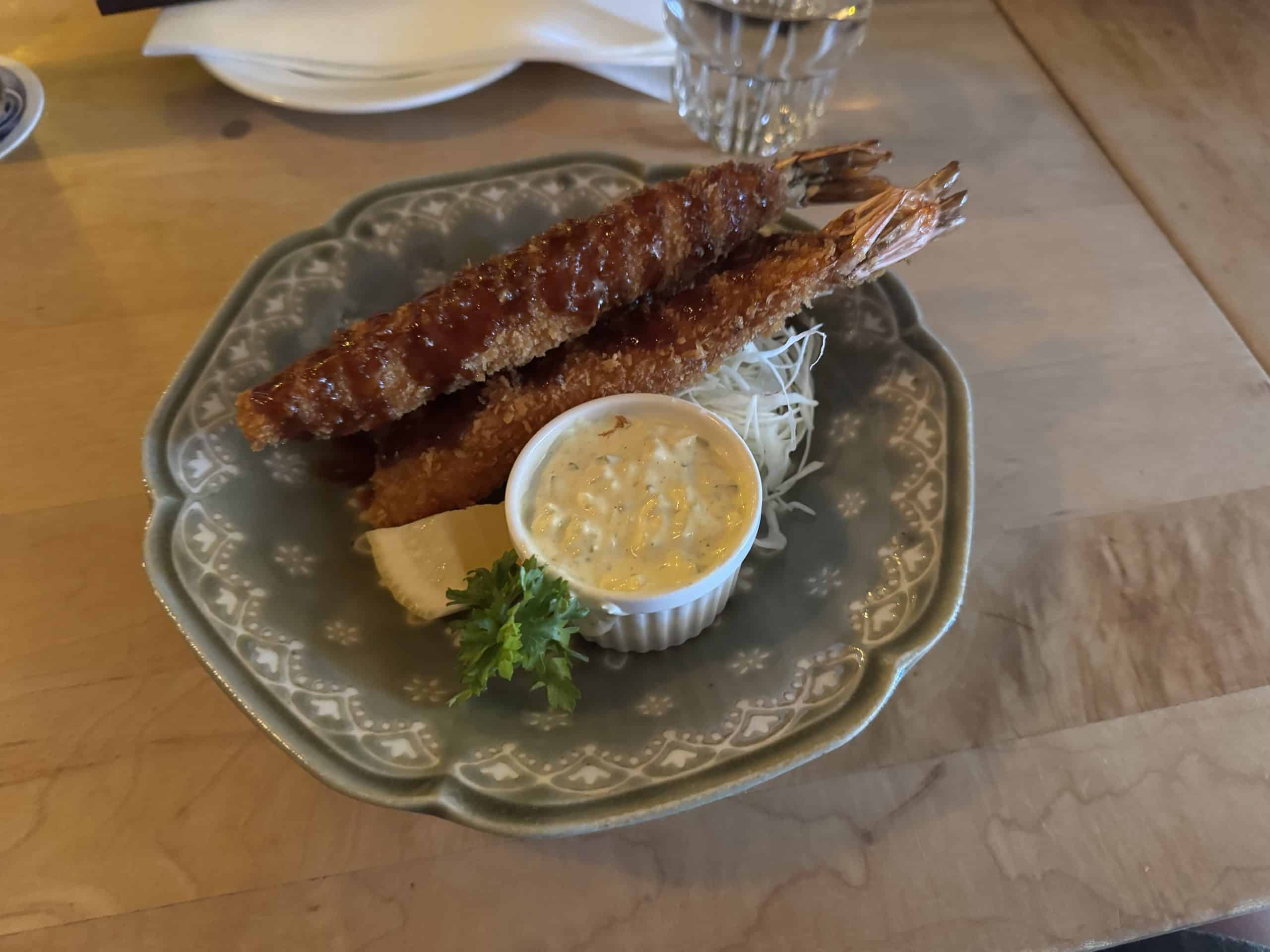 The ebi fry is textbook. Giant, snowy shrimp are encased in the crunchiest panko coating drizzled with a smoky, savoury sauce. A creamy tartar on the side adds richness, while an accompanying lemon wedge and frizzle of cabbage break up the heaviness of the fried dish.
