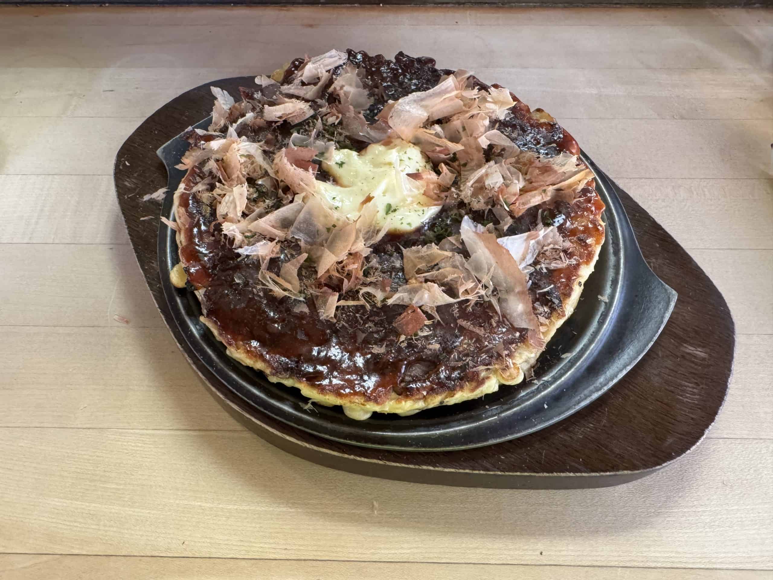 The most popular okonomiyaki styles are pork, beef and shrimp in that order, but they also offer bacon, chicken, squid, veggie and scallop varieties, as well as other Japanese dishes aside from okonomiyaki. The pork okonomiyaki is hearty enough to possibly even share amongst two people, packed with crispy meat and crunchy cabbage.