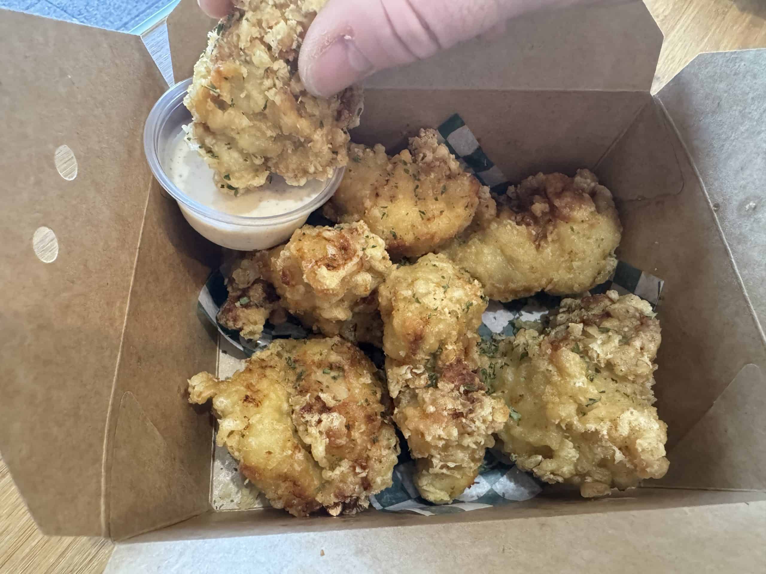 The coating on the fried chicken here is very light and tempura-like, and the dish comes with a ranch-like dipping sauce that’s creamy, zesty, and a little tangy and peppery.