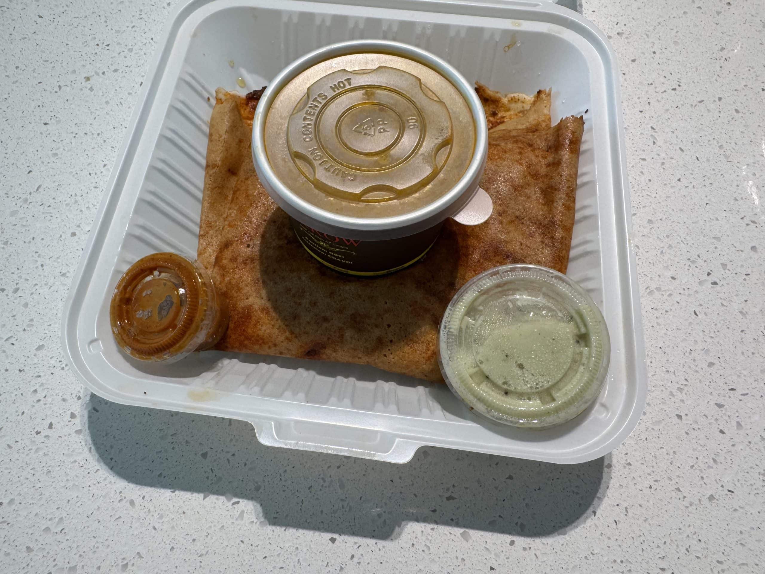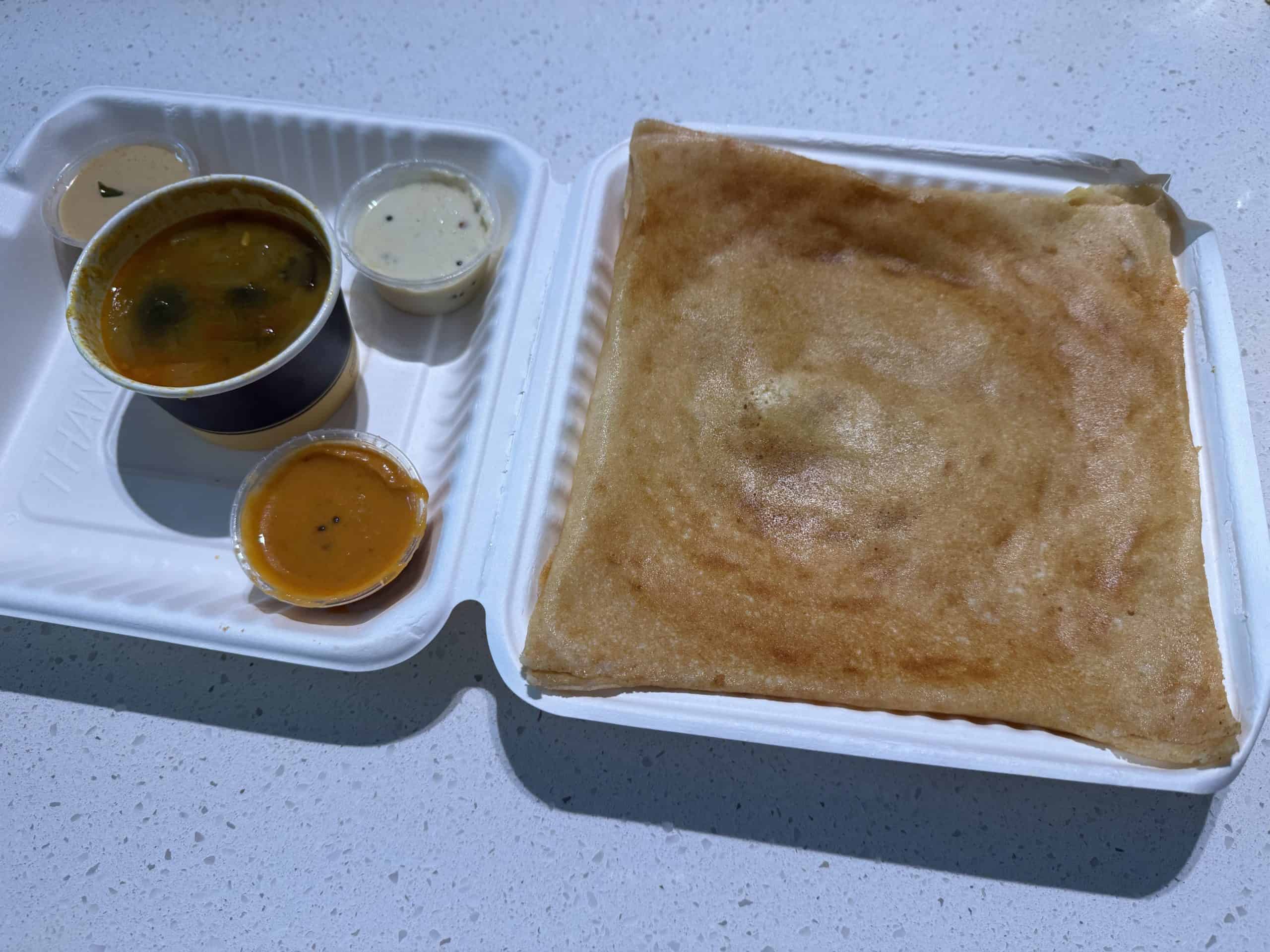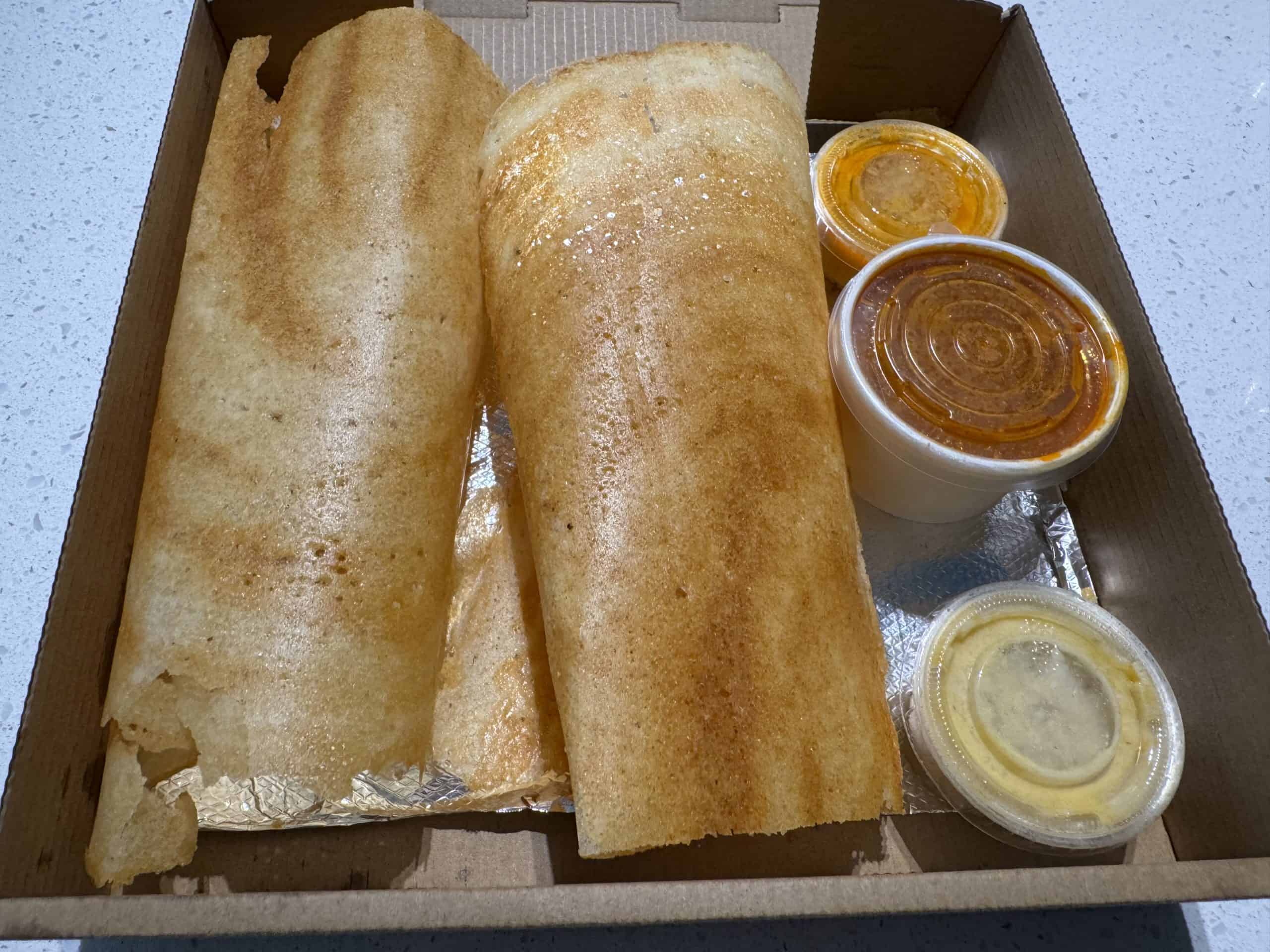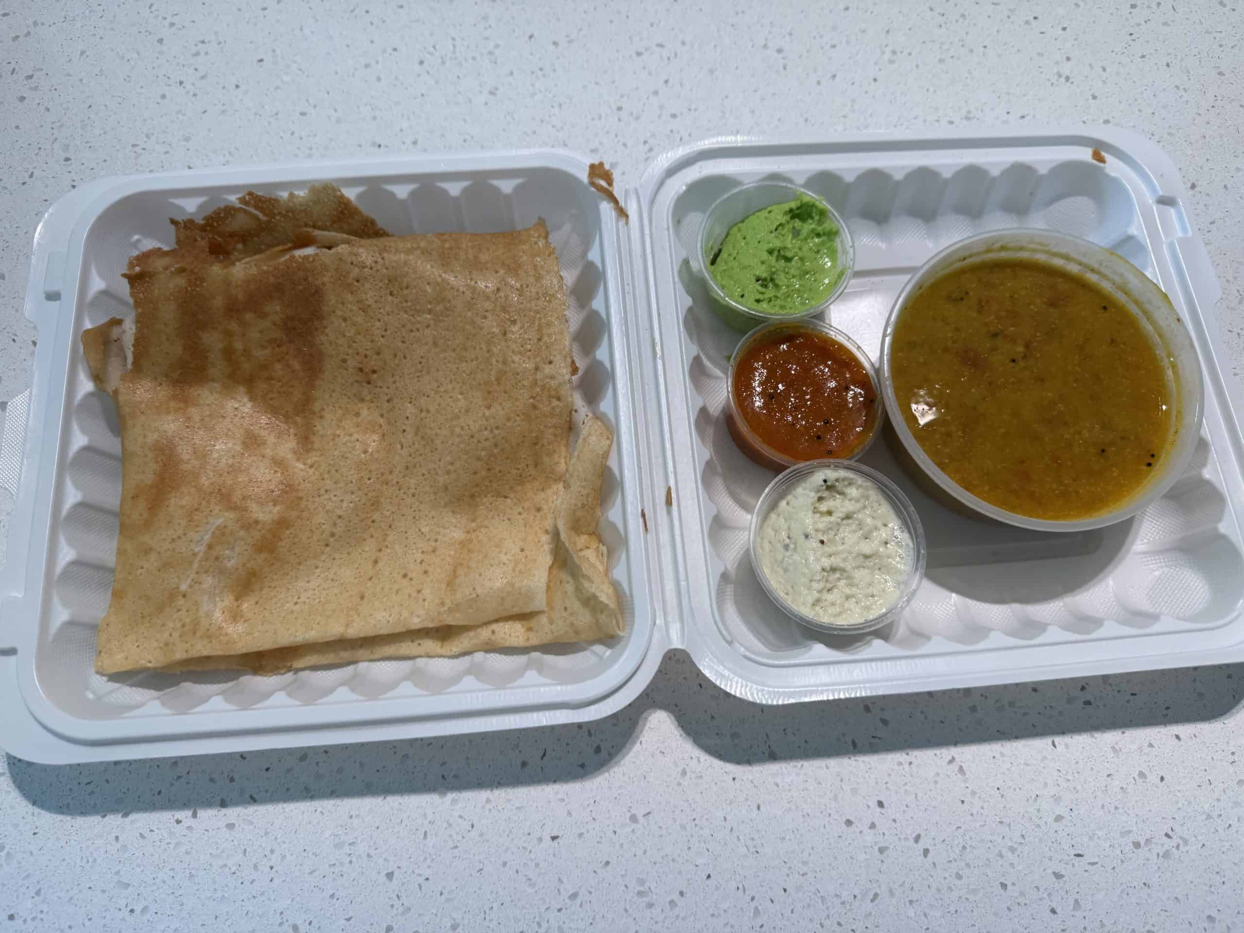 The dosa has a very smooth surface, and a classic masala dosa is filled with a mildly spiced potato mixture. Their sambar is generously loaded up with veggies, and the chutneys are by turns nutty and nicely spicy.
