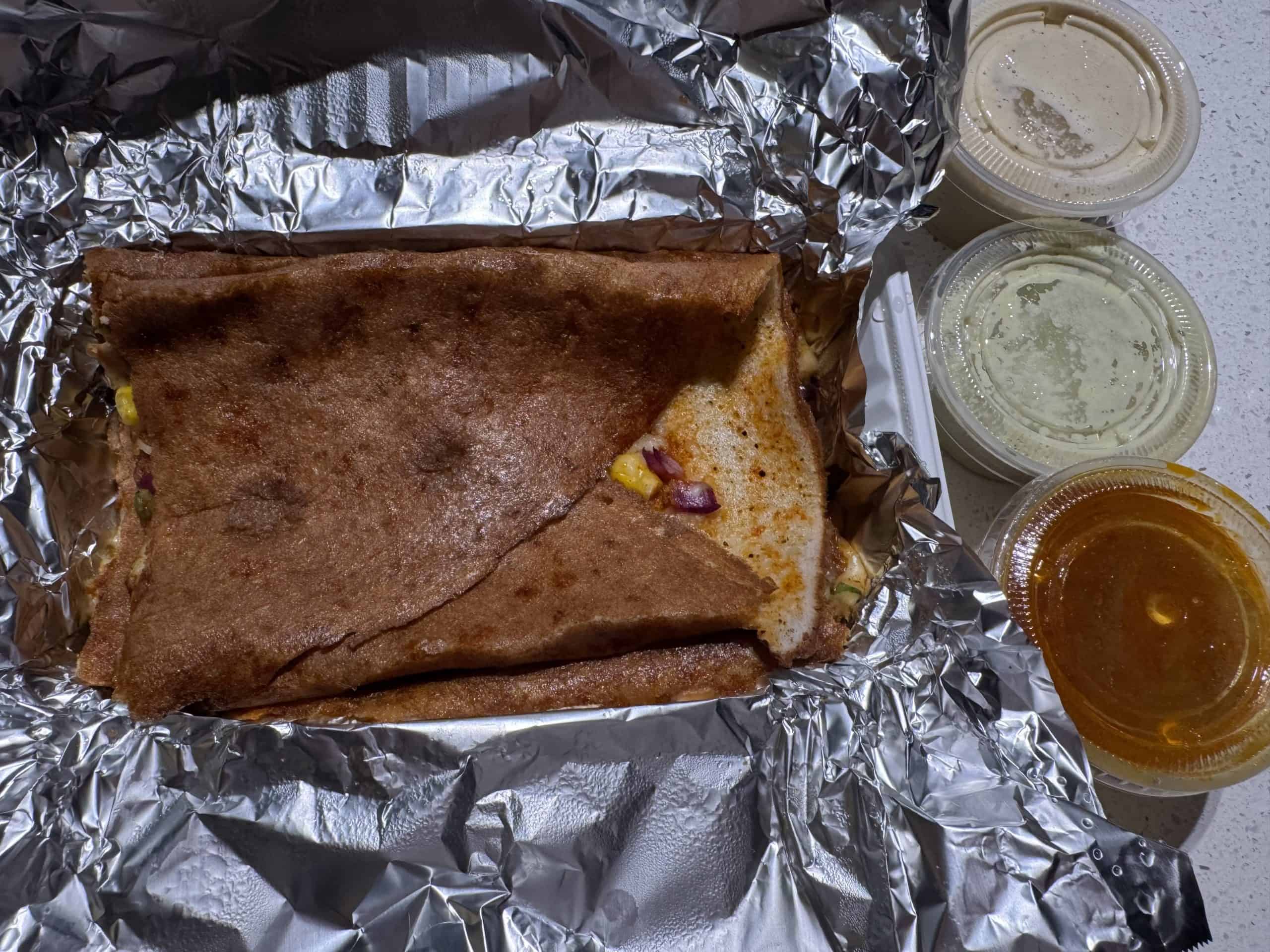 One of the signature offerings of this restaurant known for its dosa is their pizza dosa, which loads up their deeply browned, buttery dosa with lots of toppings like cheese, corn and onion so that it’s almost like a pizza. Similar to a slice of pizza, it’s easy to eat folded up into a delightful package.