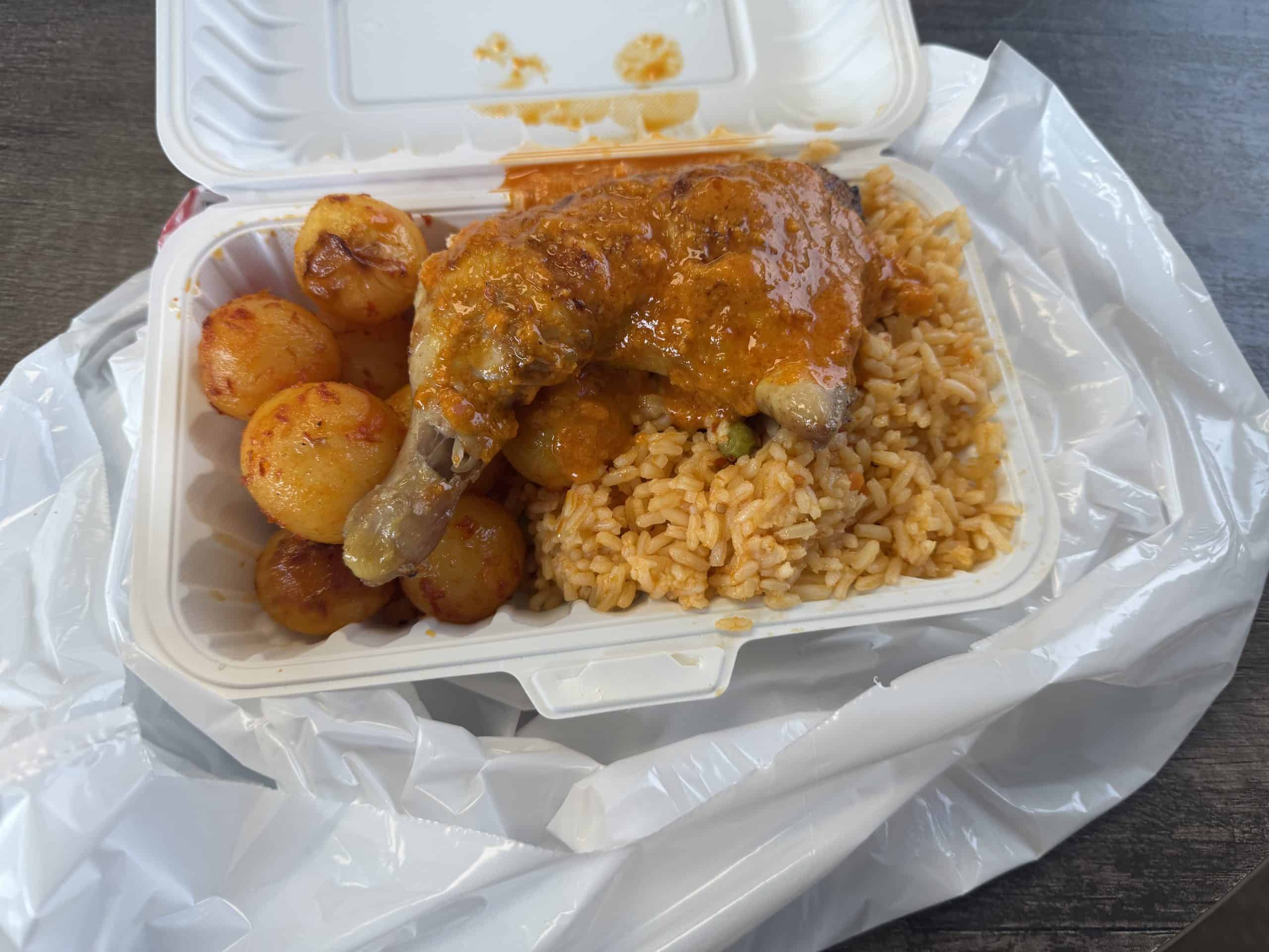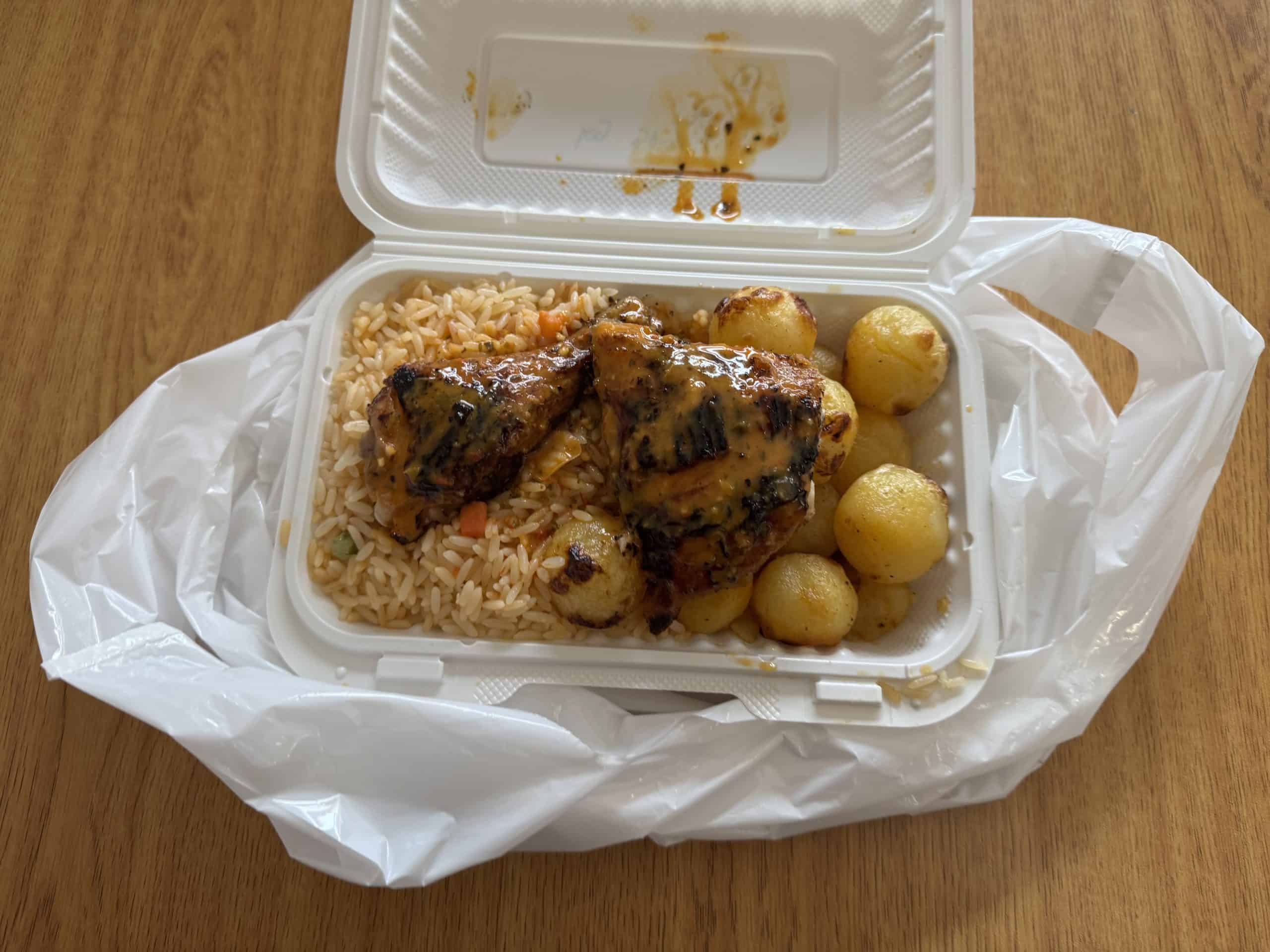 The chicken and the traditional rice and potato sides are all well accompanied by a signature deep brown-burgundy smoky sauce with a touch of heat. Much of the real estate in this tiny spot is devoted to chicken production, leaving just a little space for standing room only.