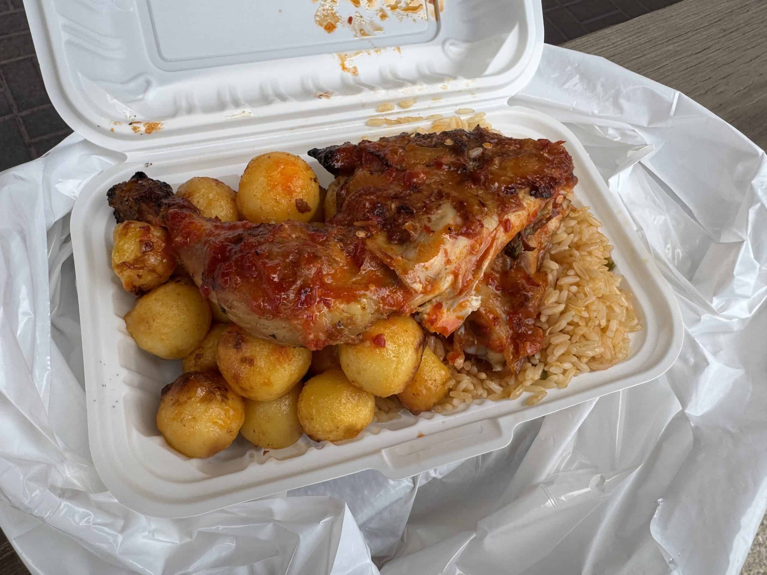 Grab spicy chicken from this churrasquiera, and you’ll receive chicken absolutely bathed in a thick, bright orange sauce. It’s not extremely spicy, but it does have a decent kick thanks to lots of big chunks of garlic. The chicken is glistening on the inside, and pulls away easily from the bone.