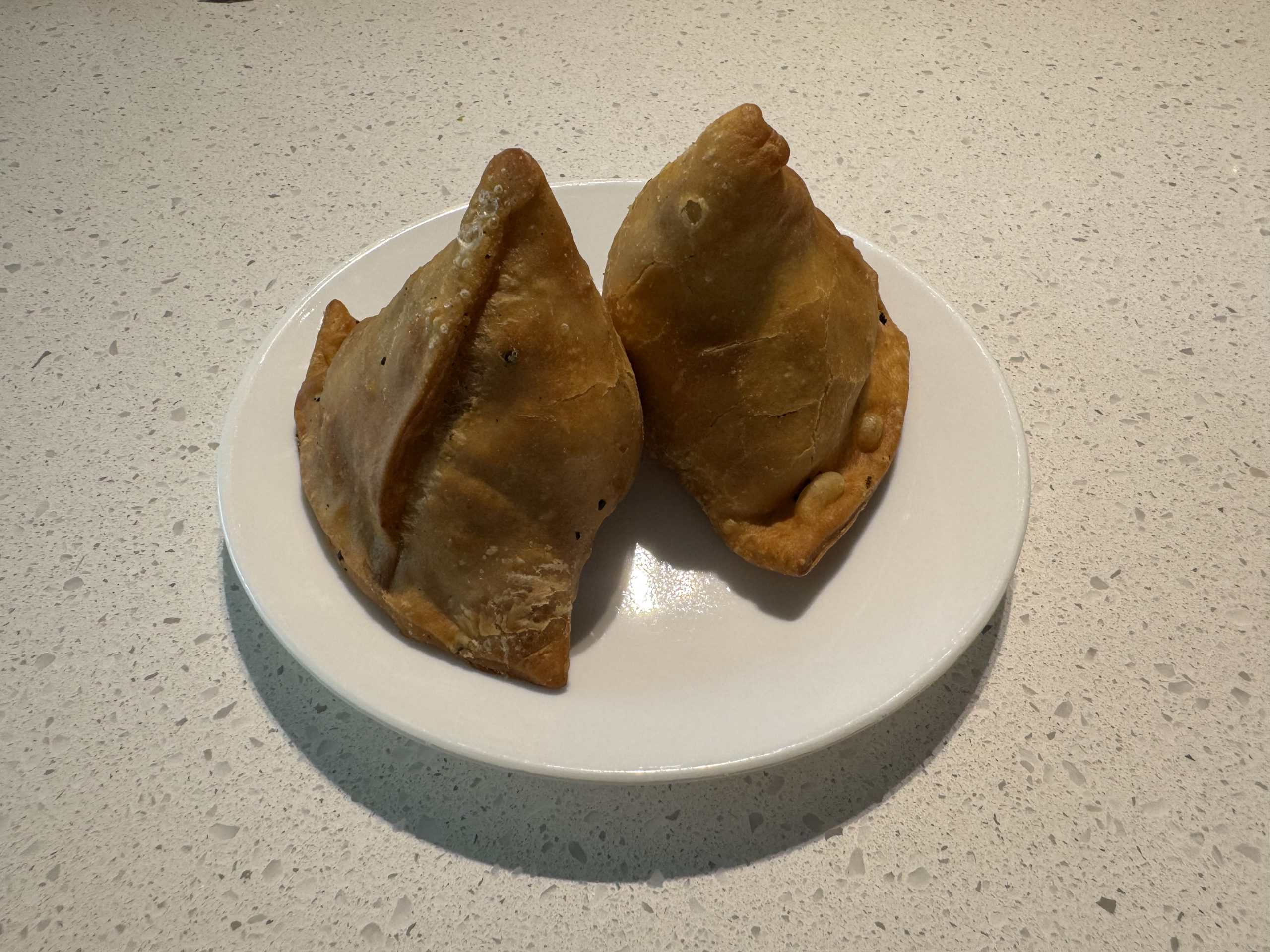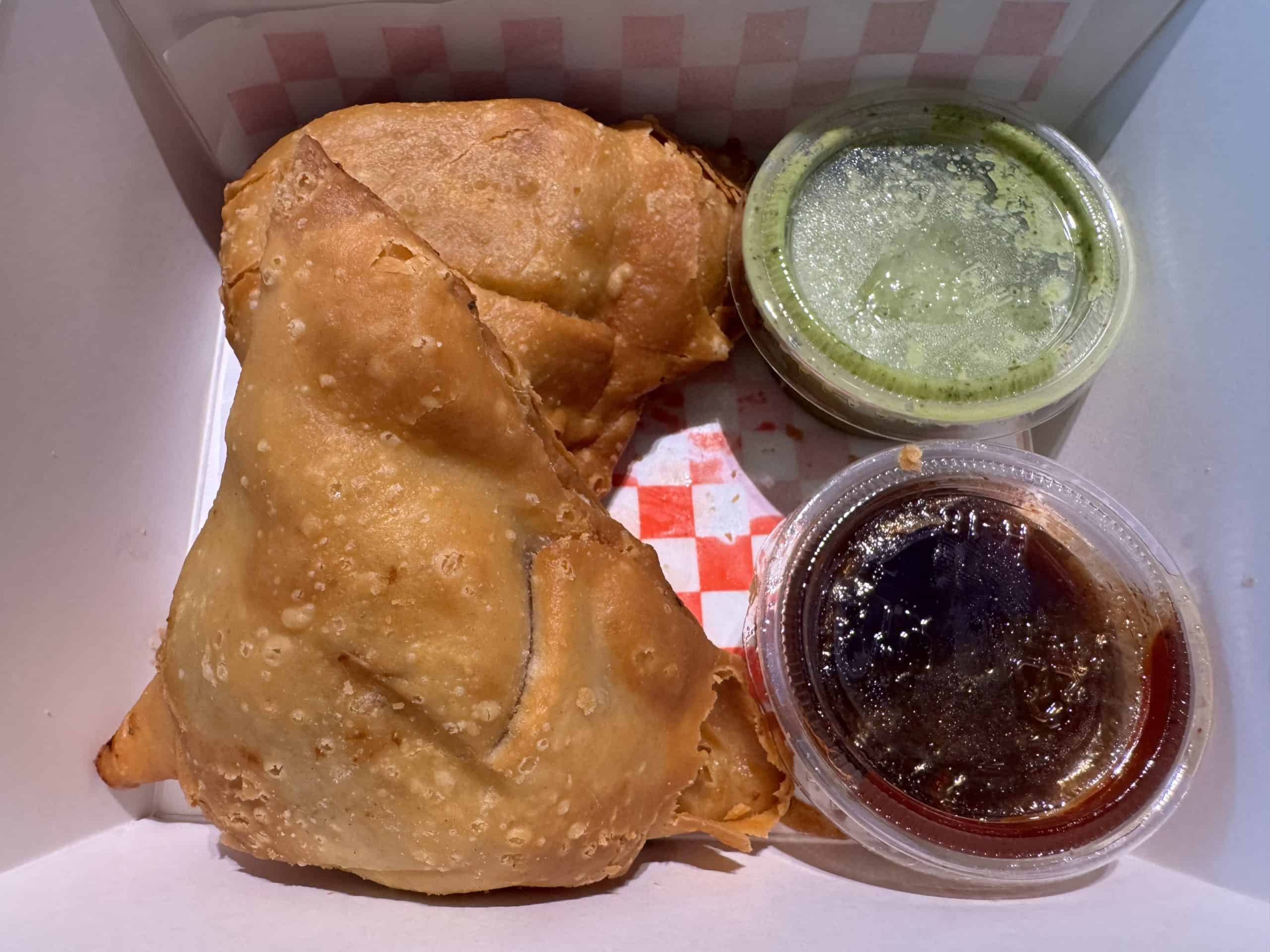 Samosa varieties on offer include potato and pea, palak paneer and paneer tikka. The standard potato and pea samosas have an herby veggie filling with fluffy potato. All samosas from here are best enjoyed with their sticky sweet tamarind and bright mint chutneys.