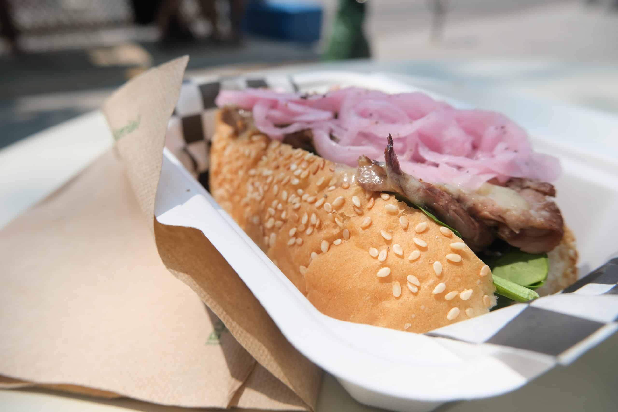 Served on fresh Italian bread, this sandwich is loaded with beef brisket, salsa verde, and chili aioli and is a testament to why this place sells out so fast.