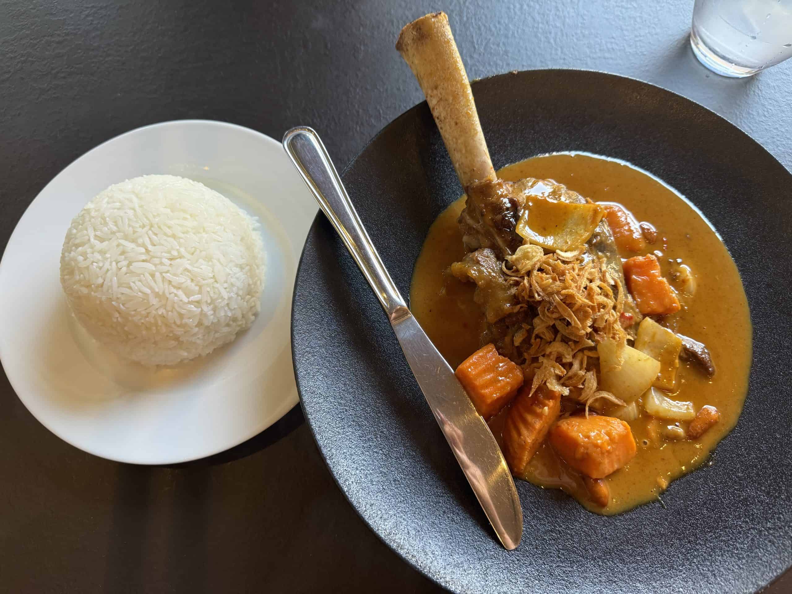 Some of those signature dishes are their fried golden bags, their fish panang curry, a duck red curry with lychee and pineapple that usually needs to be ordered at least 24 hours in advance, and a tender lamb shank massaman curry that you won’t find at just any Thai restaurant.
