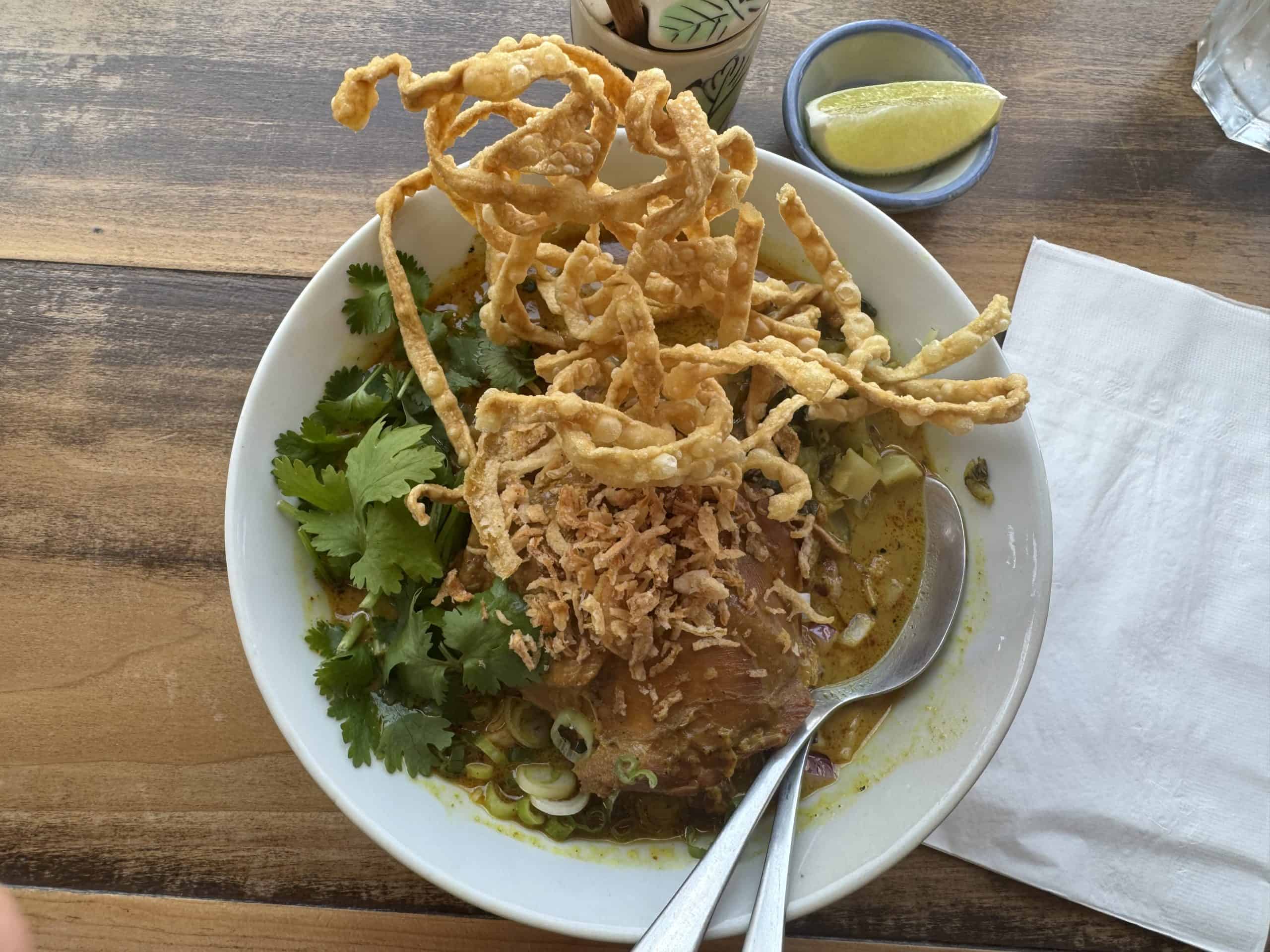 Their chicken rice is just what it sounds like, an aggressively basic dish of chicken and rice that’s schmaltzy and rich in its simplicity. The khao soi is textbook, an aromatic soupy curry that envelops slippery soft noodles, crispy fried noodles, juicy chicken, mustard greens, onions and herbs to create a symphony of intense flavours.