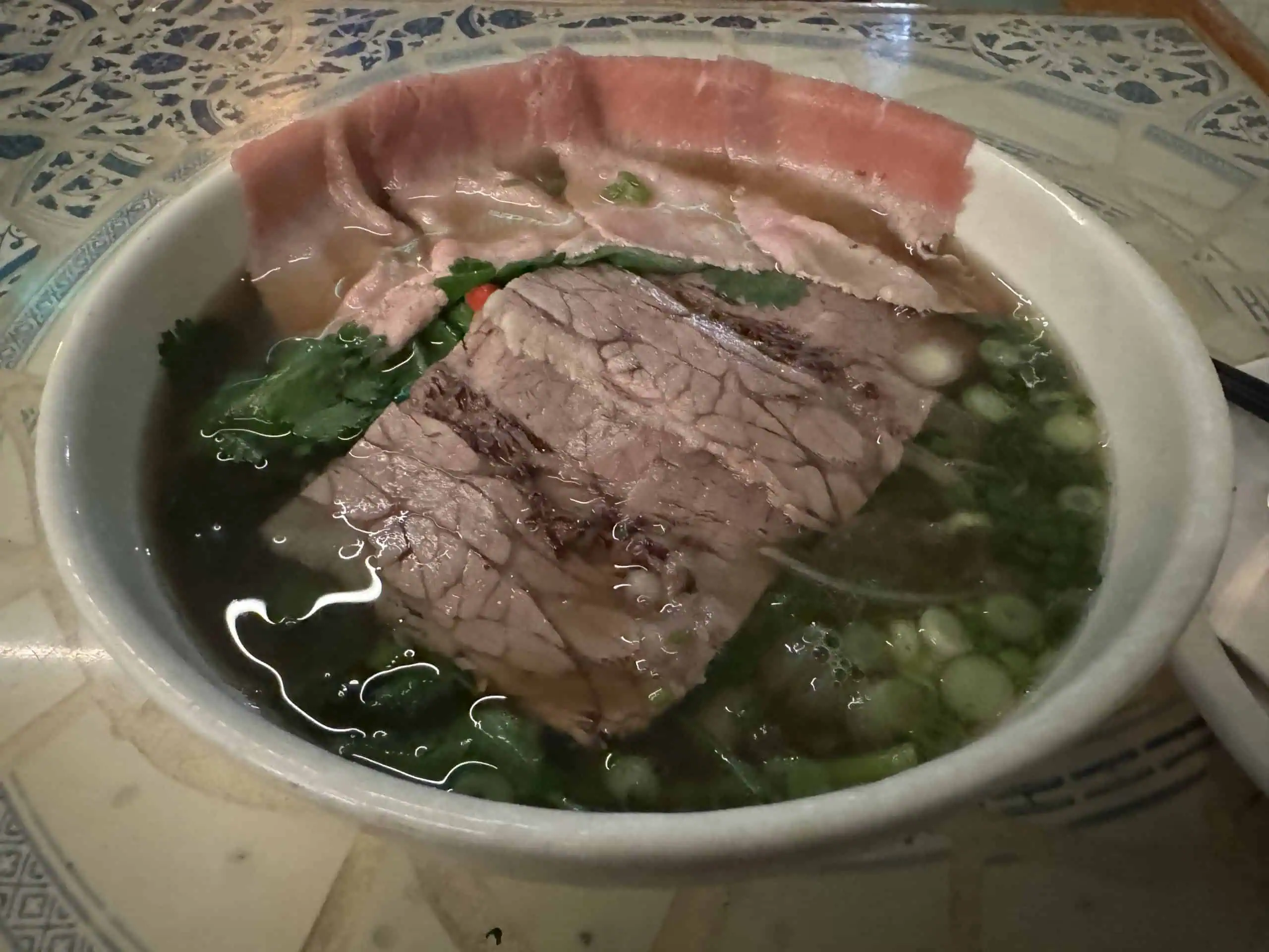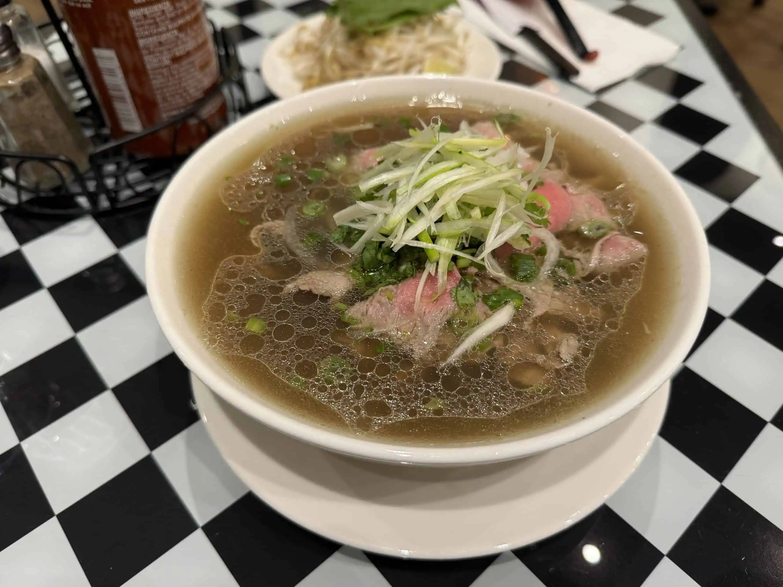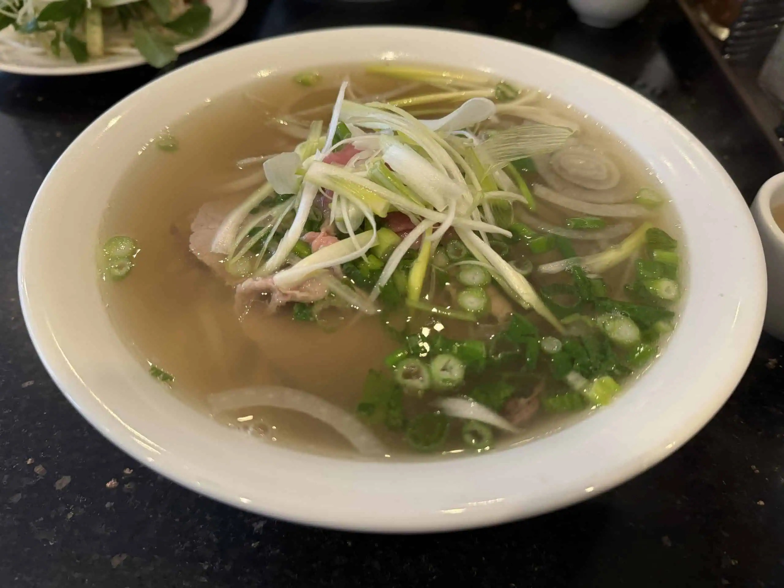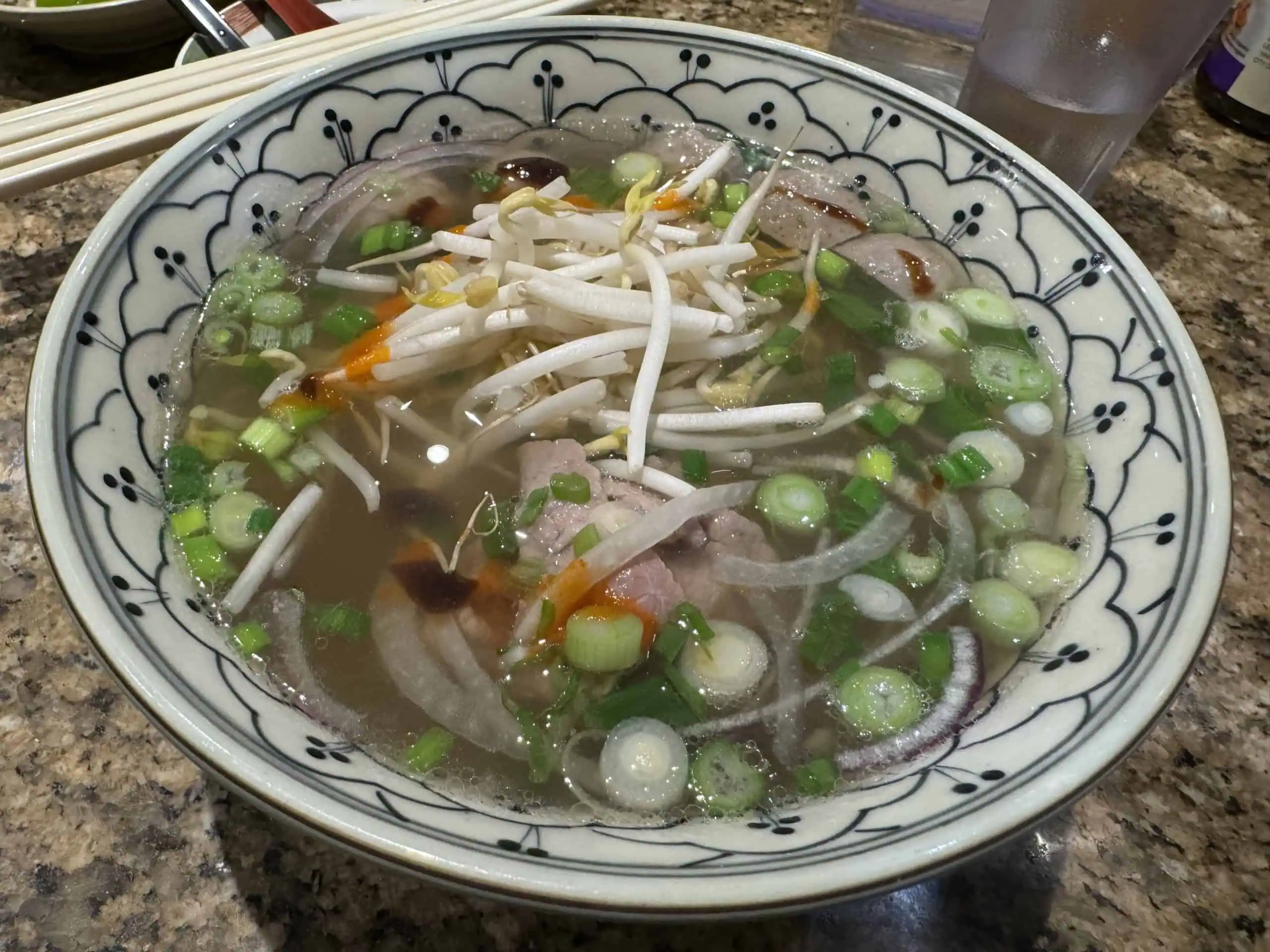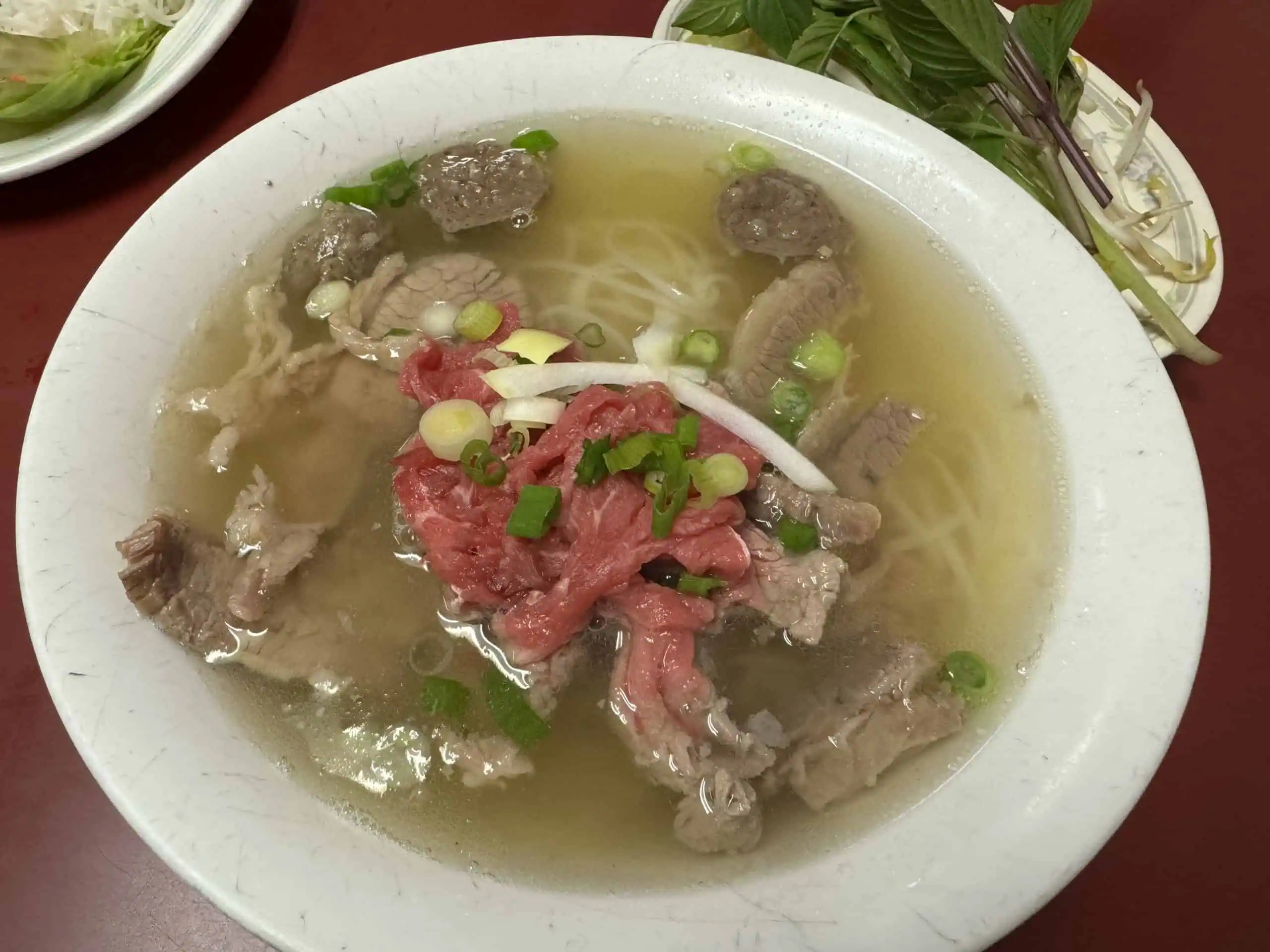 Fortunately, the default way that pho comes at this restaurant is excellent, so there’s no major need for adjustments. The beef pho comes presented with a little flair, the rare beef draped over the side of the bowl in a way that it usually isn’t at other restaurants.