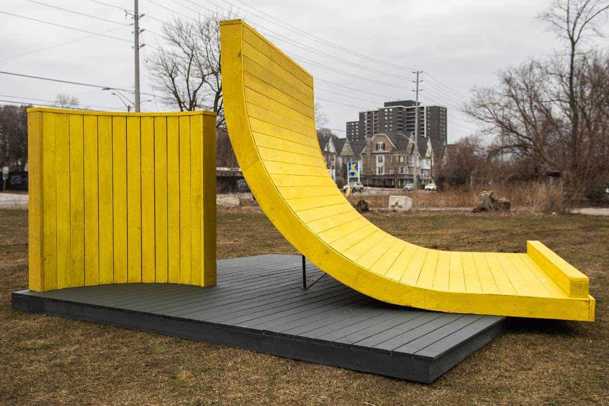 The public art pieces–”delighthouse” and “3 Surfaces Pavilion”–mark the first satellite exhibit for Winter Stations. The installations, brought in by real estate developers Brixen, are located at the Small Arms Inspection Building at the corner of Lakeshore and Dixie Rd.