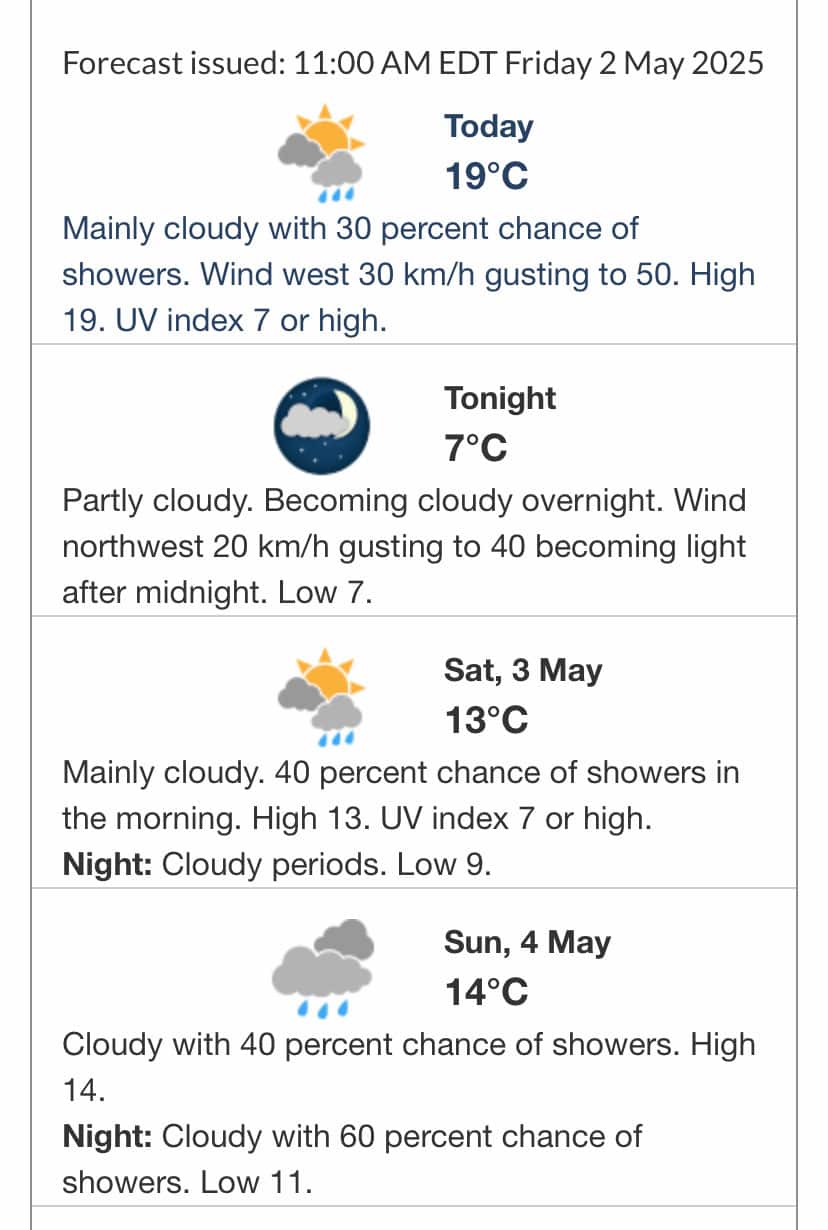 On Sunday, it is expected to be cloudy with a 40 per cent chance of showers and a high of 14 C in the morning. In the evening, there is a 60 per cent chance of showers and a low of 11 C.